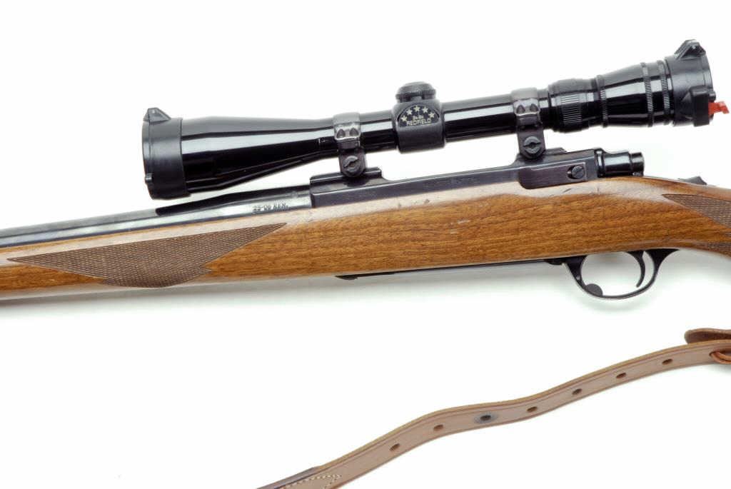 Ruger Model 77 bolt action rifle, .25-06 Rem. caliber, 24” round barrel, S/N 72-79643, blued finish, checkered wood stock, leather sling and mounted with a Redfield 3x9x scope with good optics. This rifle is in overall fine conditionshowing the majority of its original blue finish, fine bore, action, markings and wood. (Modern/PPT). Est.: $400-$800.