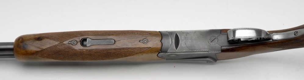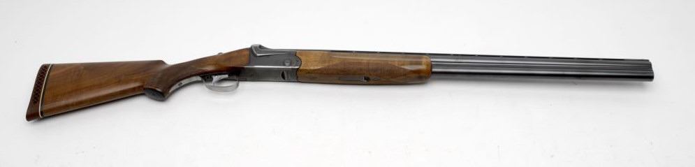 Ithaca by SKB Model 500 O/U shotgun, 12 gauge, 28” ventilated rib barrels, single select trigger, auto ejectors, S/N 519004, blued finish, checkered wood stocks in overall very good condition showing the majority of its original muted bluefinish, very good to near fine bores, crisp actions, sharp markings and very good wood stocks with added White Line hard rubber butt pad. (Modern/PPT). Est.: $300-$600.