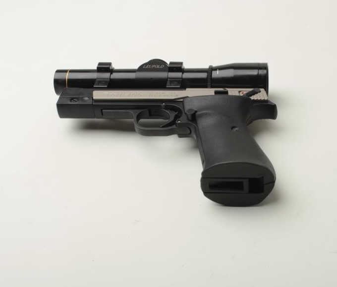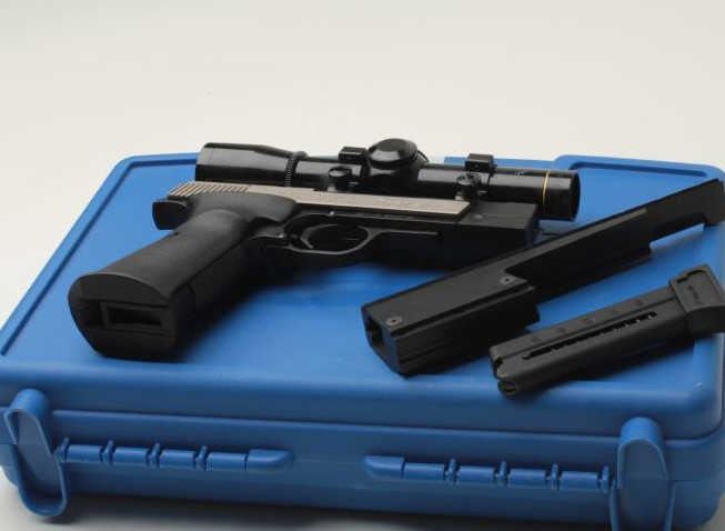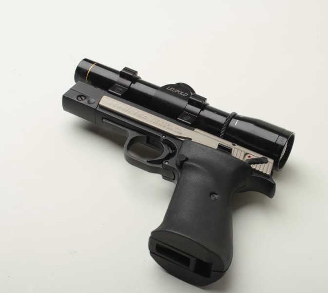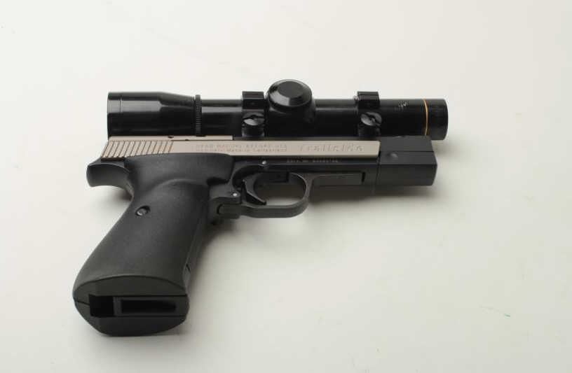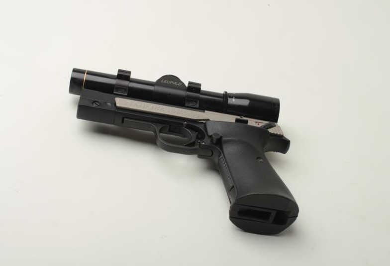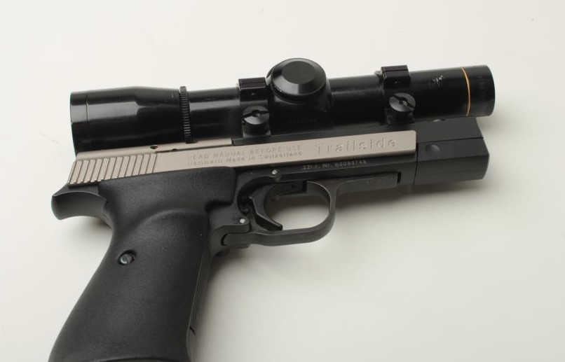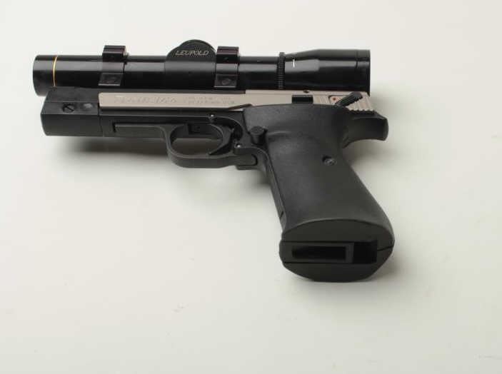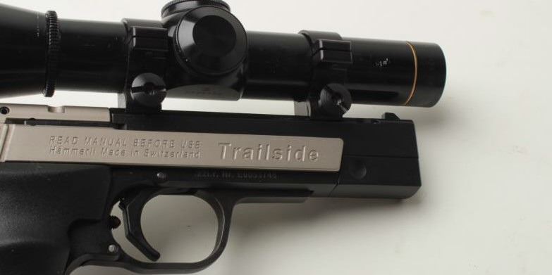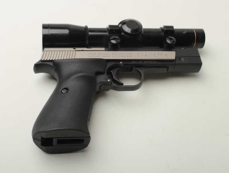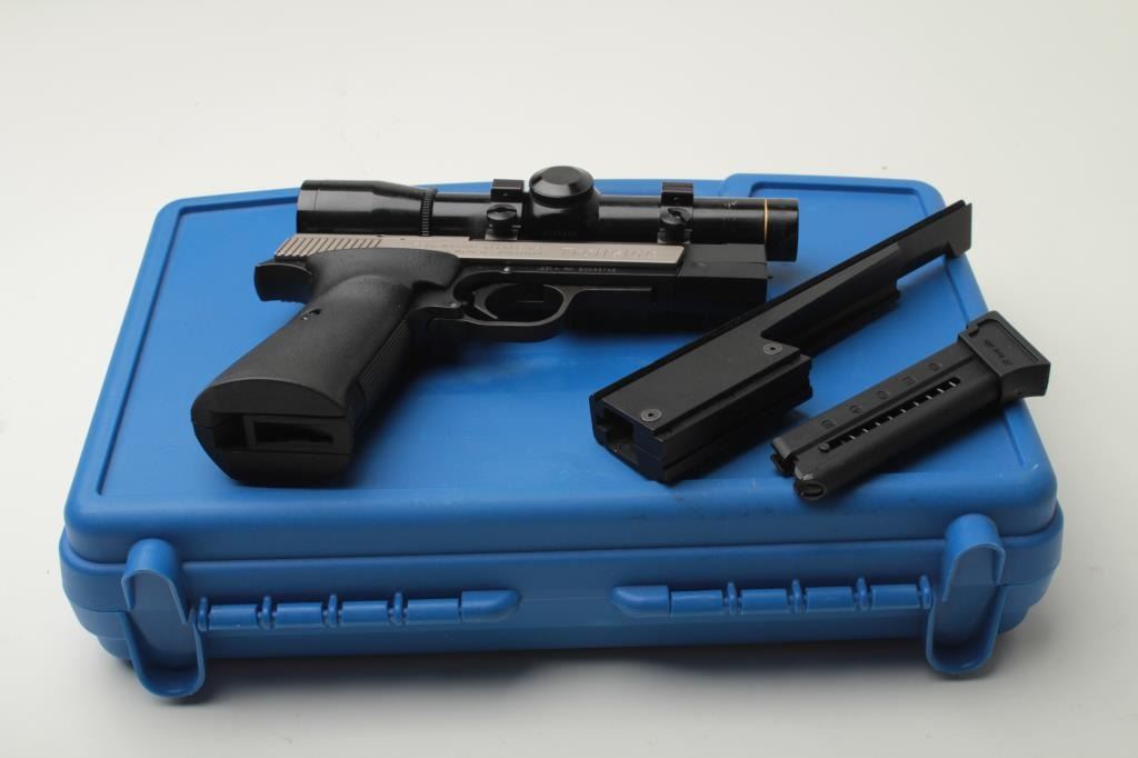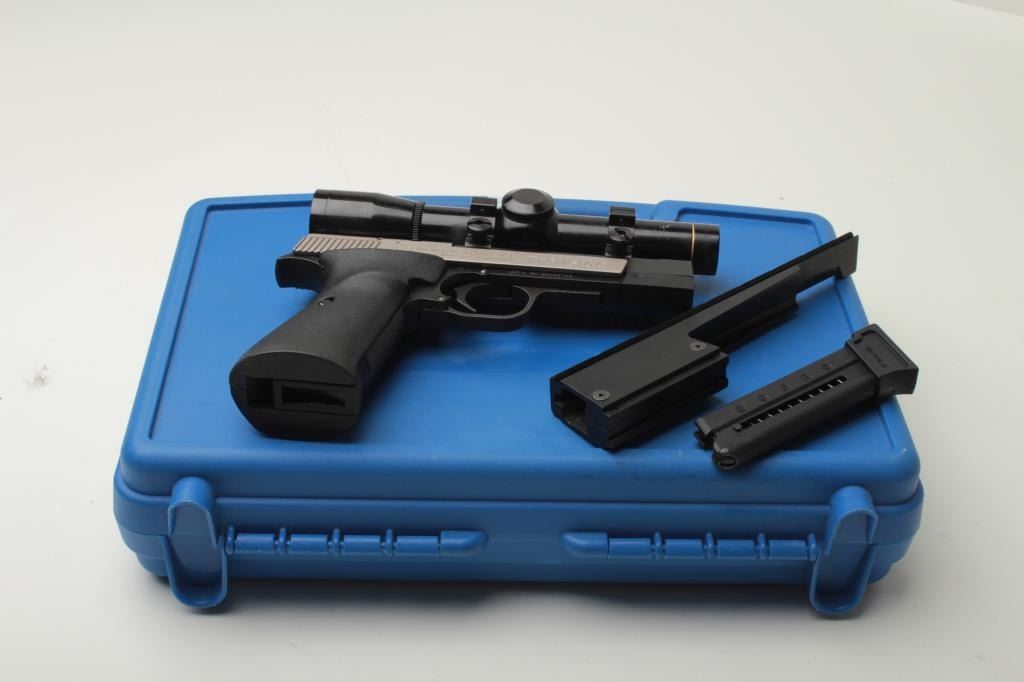 Sigarms Trailside Model semi-automatic pistol, .22LR caliber, 4.5” barrel, S/N E0053745, mounted with Leupold M8 2X Extended ER scope, 1 extra magazine, instructions manual, additional adjustable target slide and blue plastic factorycarry case. This pistol is in overall excellent condition showing little use. (Modern/PPT). Est.: $300-$600.