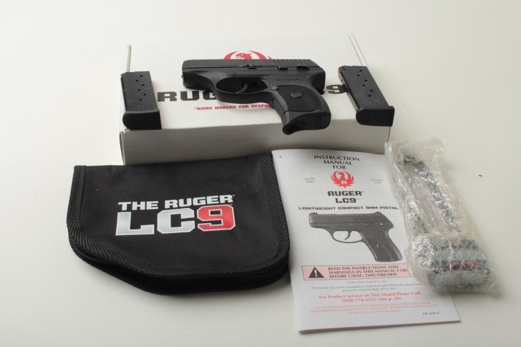 Ruger Model LC9 DA semi-automatic pocket pistol, 9mm caliber, 3” barrel, S/N 320-13808, mat black finish, polymer frame in like new condition with 2 extra magazines, instructions manual, soft carry boot and factory cardboard shipping box.(Modern/PPT). Est.: $175-$350.