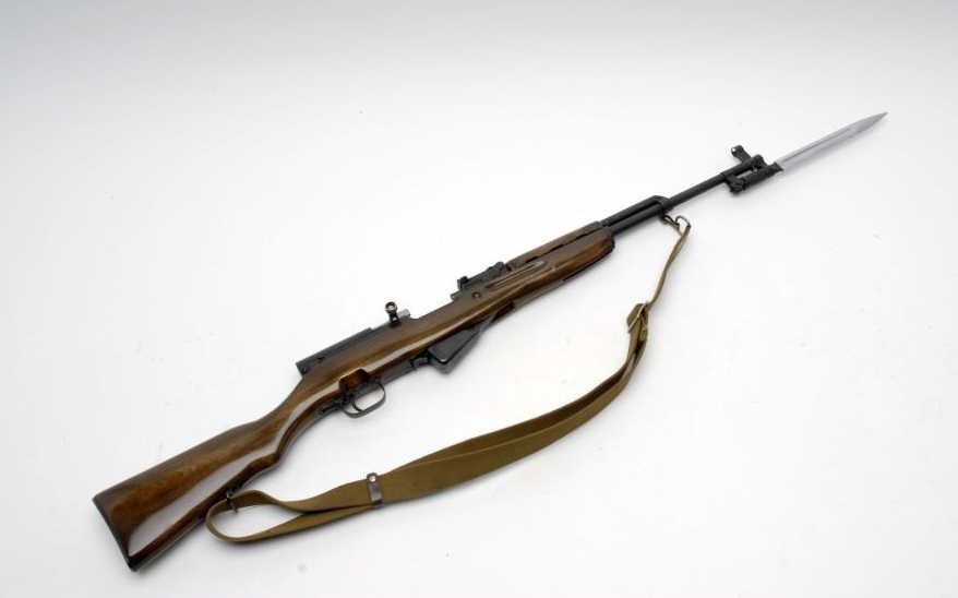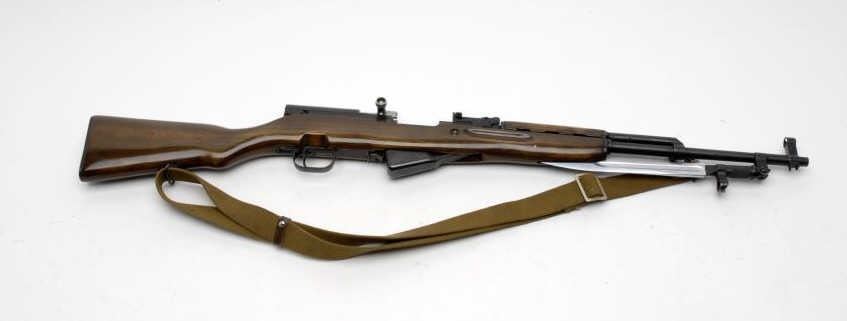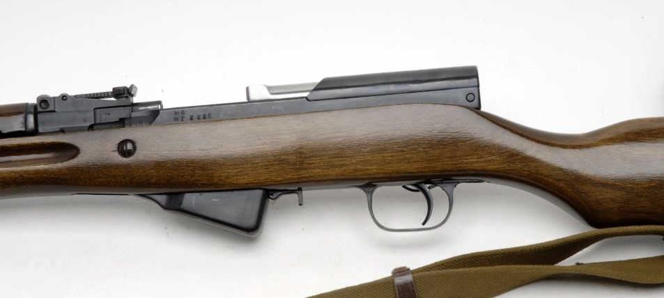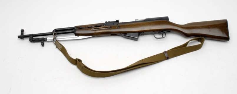 Russian SKS semi-automatic rifle, 7.62 x 39mm caliber, 19.5” barrel, import-marked, S/N 2228, blued finish, wood stock, woven sling, folding bayonet, in overall very good + condition with a crisp action, very good + bore and very good +wood stock. (C&R/PPT). Est.: $300-$600.