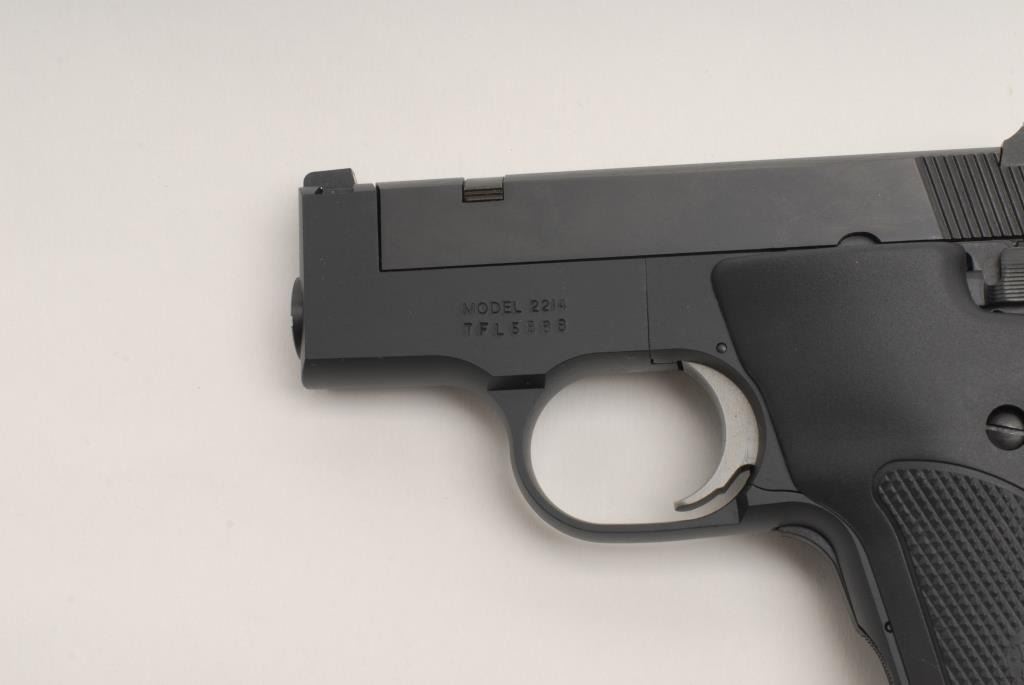 Smith & Wesson Model 2214 Semi-auto pistol, .22 L.R., 3” barrel, black finish, S/N TFL5888. This pistol is in like new condition showing little handling and no use. Accompanied by its original S&W box and paperwork. The box shows somescratches and tatters from storage. (No CA Sale) Est.: $125-$250