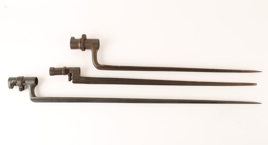 Lot of 3 misc. socket bayonets; one is 24” overall and marked with an “A” and circle ‘M’ with diagonal mark thru it; another is 19” overall with a “13” stamped on the side of the socket and 2 illegible proofs at the base of the blade; thelast bayonet is 20” overall and has a four sided blade; it also has a S/N 4712 and a 5 pointed small star, both at the base of the blade. Est.: $150-$300.