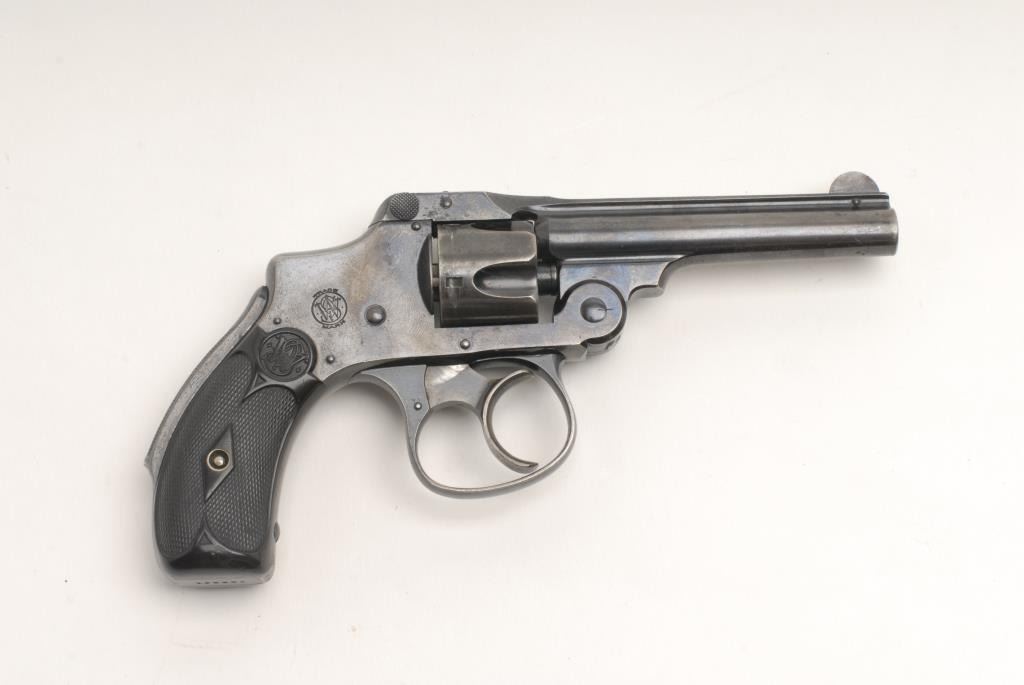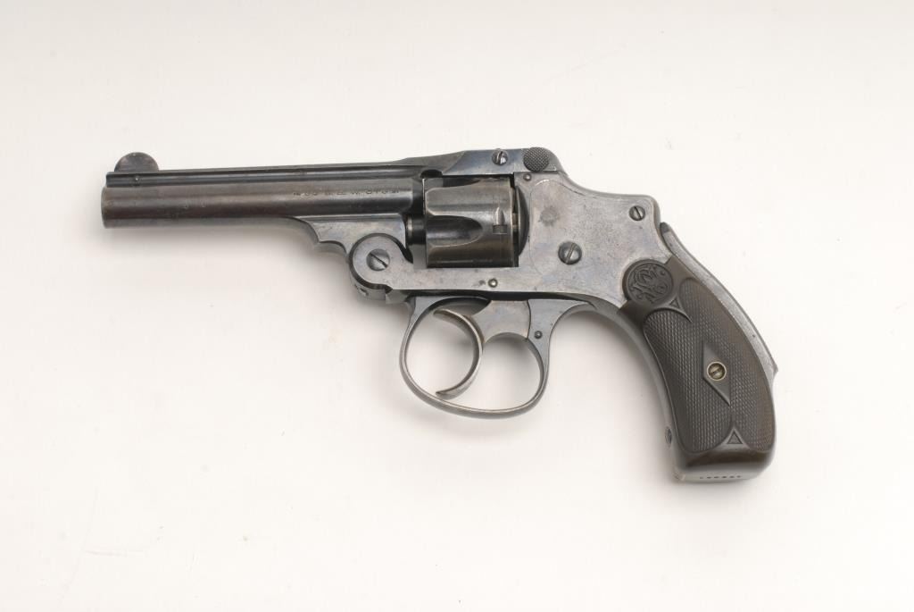 Smith and Wesson New Departure Model revolver, .32 cal., serial #138651. The pistol is in very good to nearly fine overall condition with a 3 ½” barrel. The pistol retains the majority of its original thinning blue finish with small mars andloss of finish at the muzzle. The trigger shows muted case color still evident. The hard rubber, Smith and Wesson marked checkered grips are in very good condition although they differ in color slightly. The markings are sharp and legible onthe frame and barrel. The bore is very good and the action remains crisp. Est.: $150-$300. (C+R).