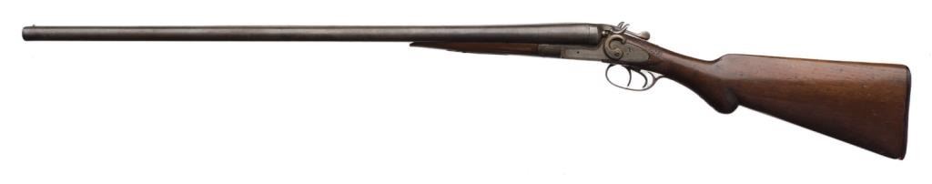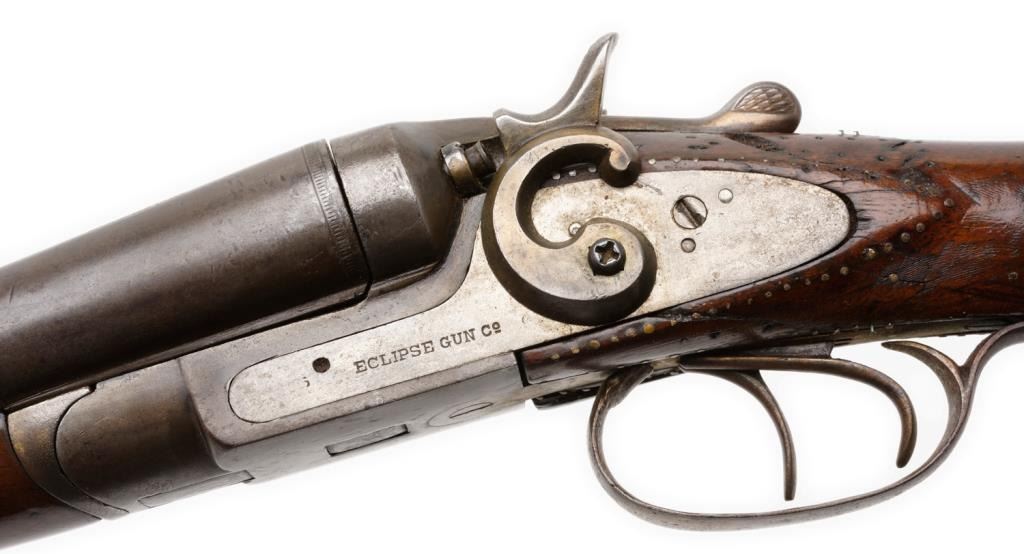 ** Side-by-side exposed hammers shotgun marked “Eclipse Gun Co.”12 gauge, repaired wood butt stock; would make a good wall hanger display. Est.: $50-$100.
