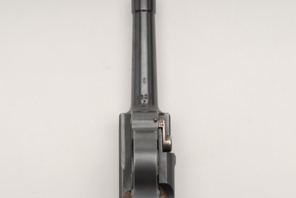 Lot 85d 1920 Commercial Luger in .30 caliber, S/N 8722i by D.W.M. with stock lug and German “Safe” markings