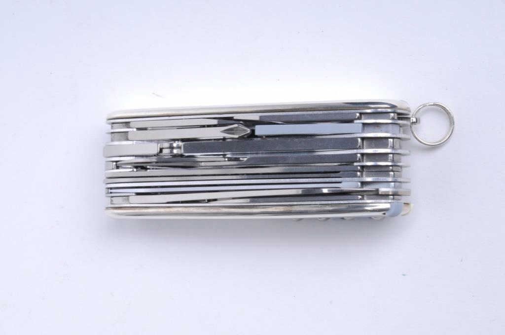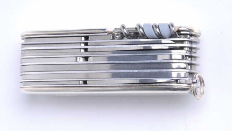 Lot 100e Ultra-deluxe Swiss Army knife signed “Tiffany” and marked sterling and 18K. Mint with blue box and