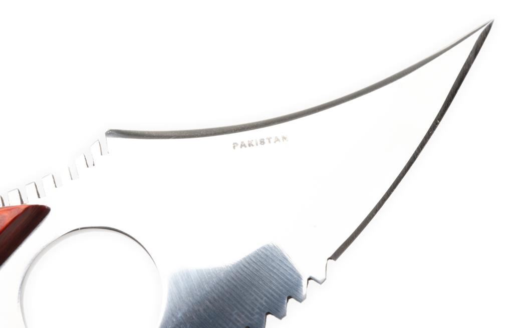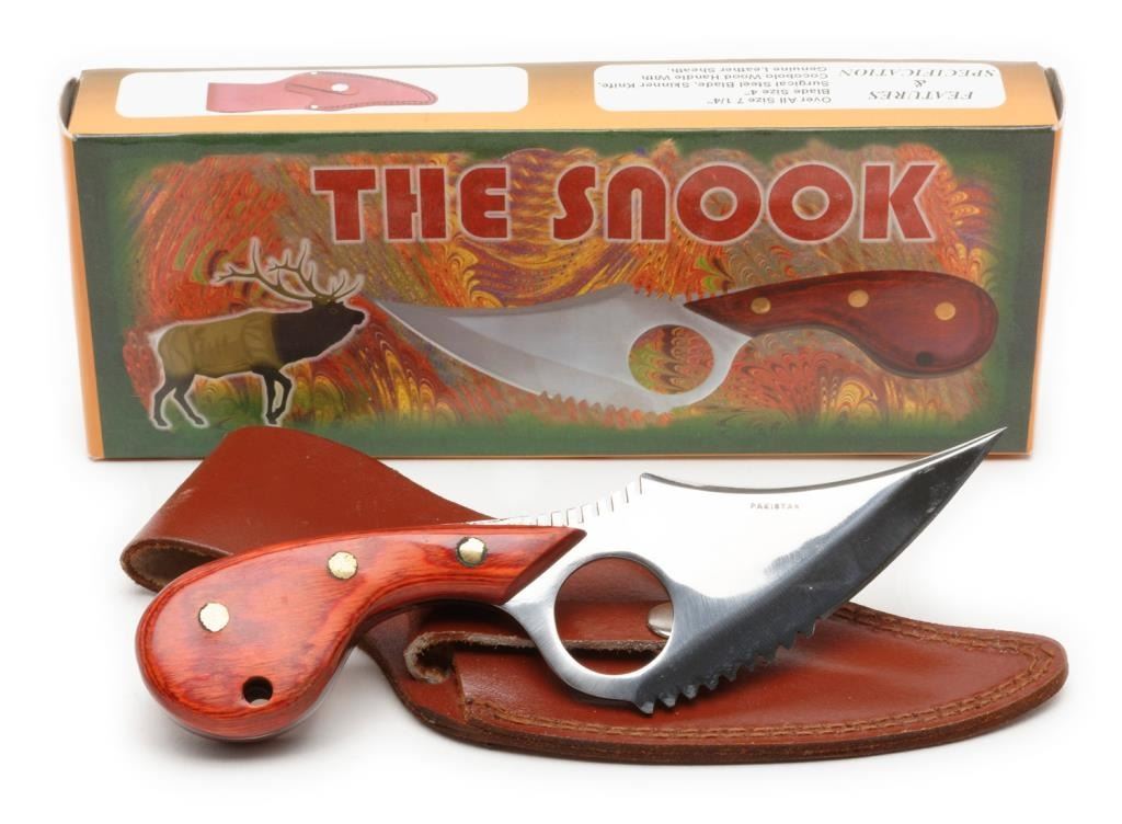 “The Snook” skinning knife with leather sheath and factory cardboard box; knife is like new and approximately 7.25” overall with a 4” blade. Est.: $50-$100.