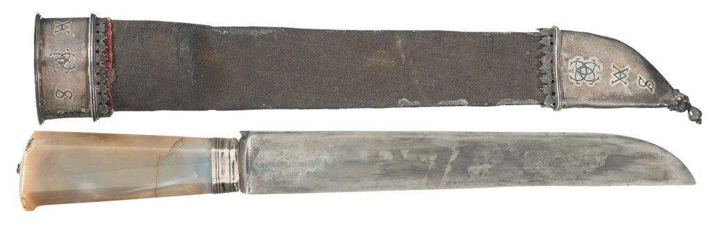11 5/8" OAL, with an unmarked 7 7/8" sheep's foot pattern blade, silver paneled brass collar, smooth octagonal-faceted semi-precious stone grip, small silver pommel cap and a cloth covered horn sheath with silver furniture. No hallmarks are present. Fair overall with some chips and cracks on the grip, wear/material loss on the sheath, and some grain cracks and mixed patina on the blade.