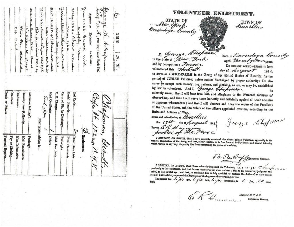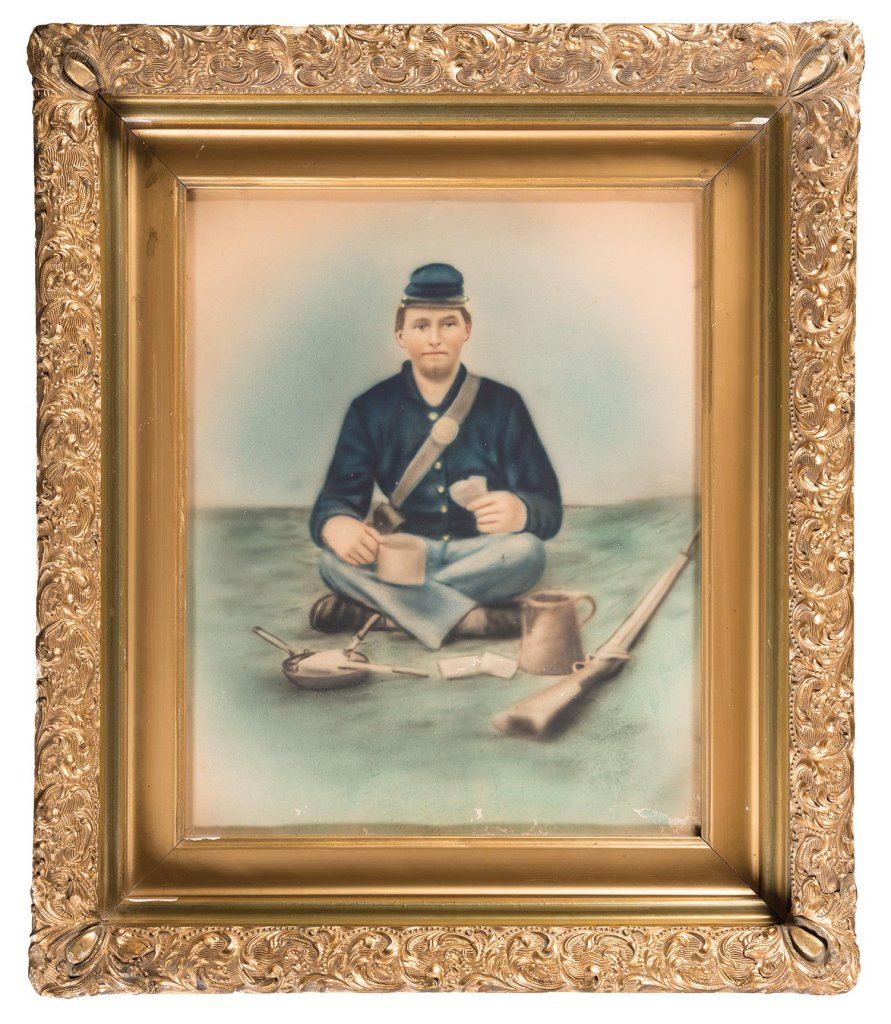 This portrait is fitted in a gilt veneer frame measuring 17 inches wide and 20 inches tall. It depicts a Union soldier seated in a field, cup in hand, and his rifle and mess kit arrayed around him. The young man has been identified as Private George H. Chapman. The portrait matches an original quarter plate tintype previously identified as Chapman. The 122nd New York fought as an element of VI Corps in the Army of the Potomac and fought at in many important battles, including Gettysburg, Wilderness (after which Chapman is recorded as taking a "severe" arm wound in a period newspaper), Antietam, and Cedar Creek (where Chapman took additional wounds). He is listed as discharged on May 22, 1865, as a corporal since Sept. 1, 1864, and wounded on Oct. 19, 1864. Condition: Very good. There is some mild wear along the lower edge of the painting and a few light chips and scuffs.