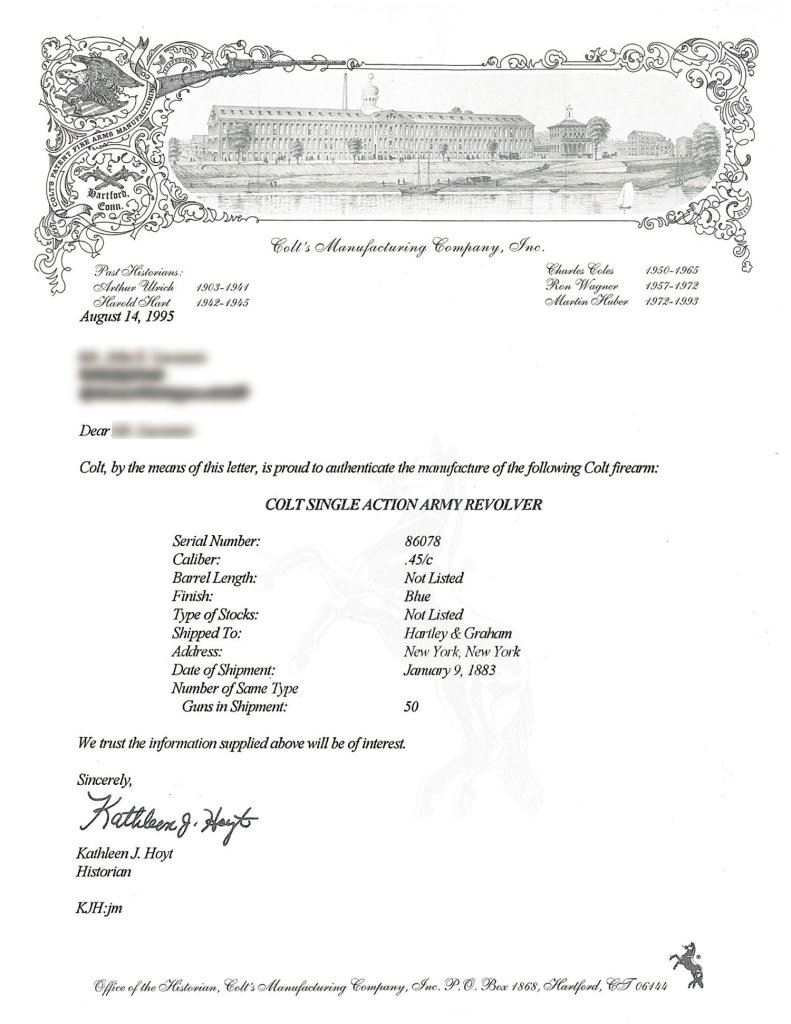 The letter lists it as one of fifty shipped in .45 Colt with a blue finish (blue/casehardened) to Hartley & Graham in New York City on Jan. 9, 1883.