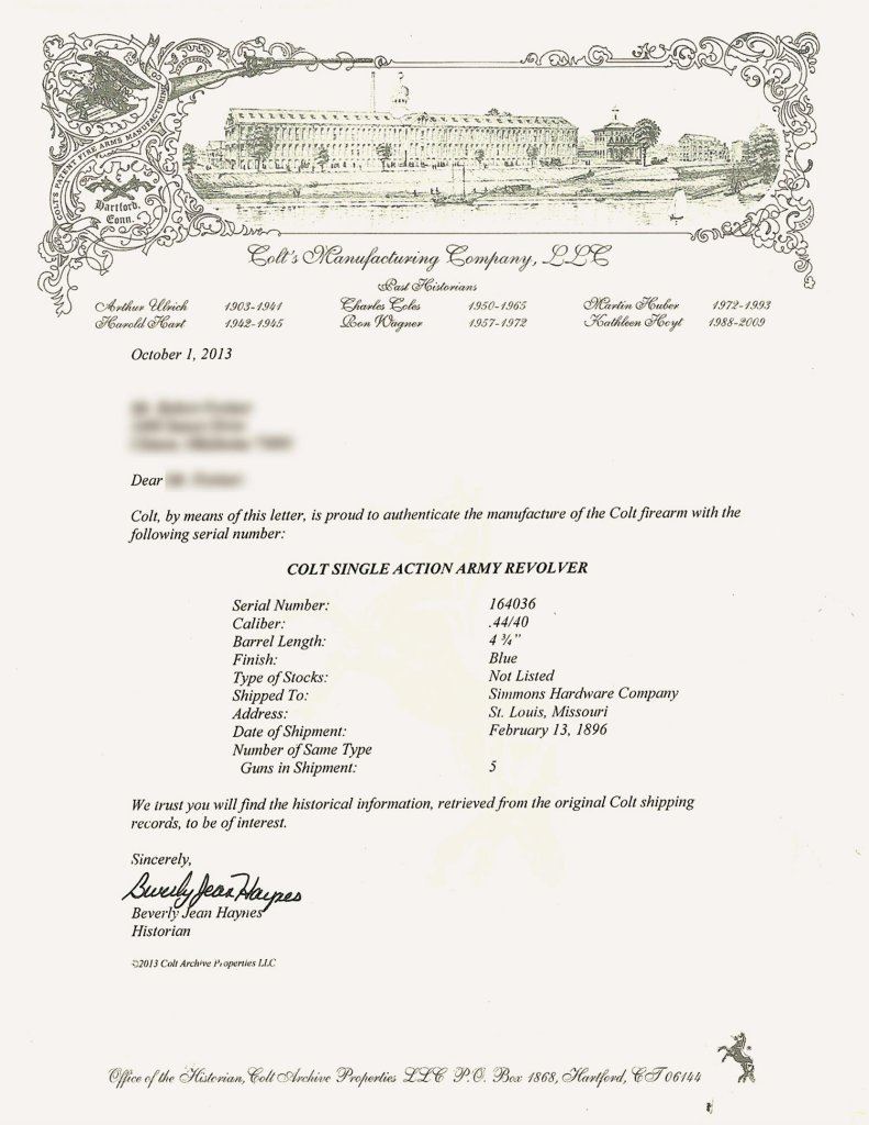 The letter confirms it and four other revolvers in this configuration were shipped to Simmons Hardware Co. in St. Louis on Feb. 13, 1896. Very late black powder frame!