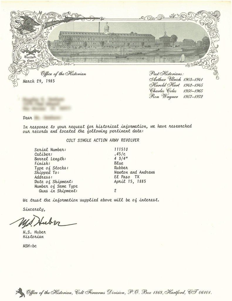 This revolver and one other were shipped in this configuration but with rubber grips to Newton & Andrews in El Paso, Texas, on April 15, 1885.