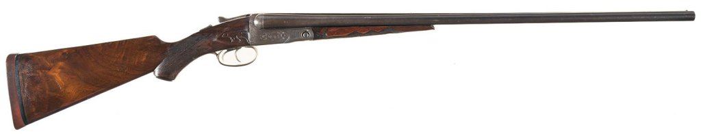 Manufactured in 1923. The forearm and buttstock feature decorative carving with a dog and duck on the right and left stock flats respectively. Features 2 1/2" chambers, improved modified/improved cylinder chokes, and 14 7/8" LOP.