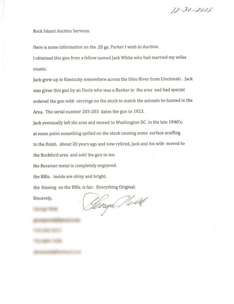 Lot 495 Engraved Parker Brothers GH Grade Double Barrel 20 Gauge Shotgun with Carved Stock