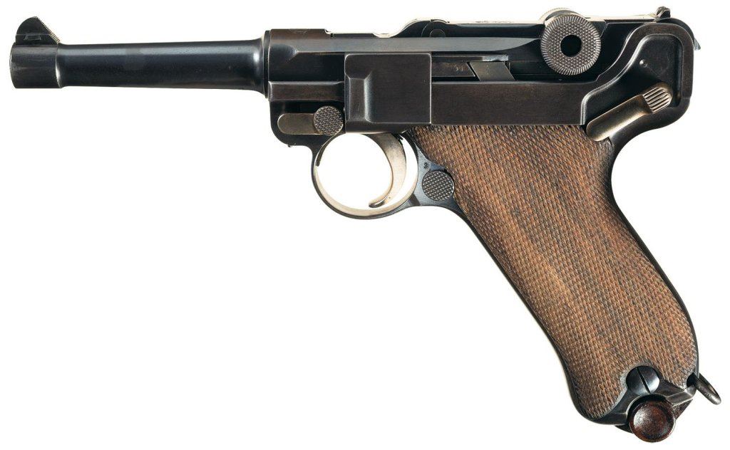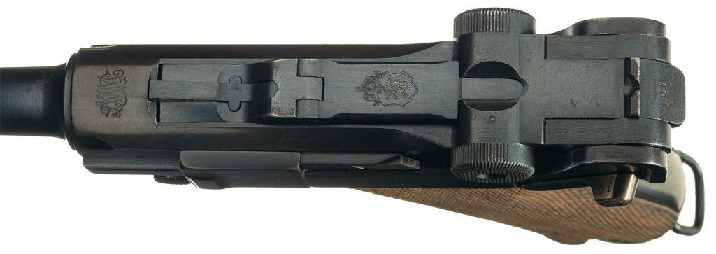 This is a desirable example of a DWM Model 1908 DWM Bulgarian contract military Luger. There were two contracts for this model with this example being from the first contract in which only 5,000 total were manufactured. These saw heavy use prior to WWI and most examples were refurbished and then reissued during WWII. Most were captured by the Russians and reworked again. This example appears to have been reworked only once! It has the correct "DWM" marked chamber area with the large Bulgarian crest on the front toggle and a smaller one on the right side of the barrel extension. It is correctly stamped with cyrillic markings for "SAFE" and "LOADED" on the frame and extractor. Fitted with the correct lanyard loop on the lower end of the back strap. It has a set of checkered walnut grips. It comes with two nickel plated magazine with wooden bases that has been stamped lengthwise with matching serial number of "2001" on each magazine. Complete with correct Bulgarian contract military holster that has been slightly modifed under flap.