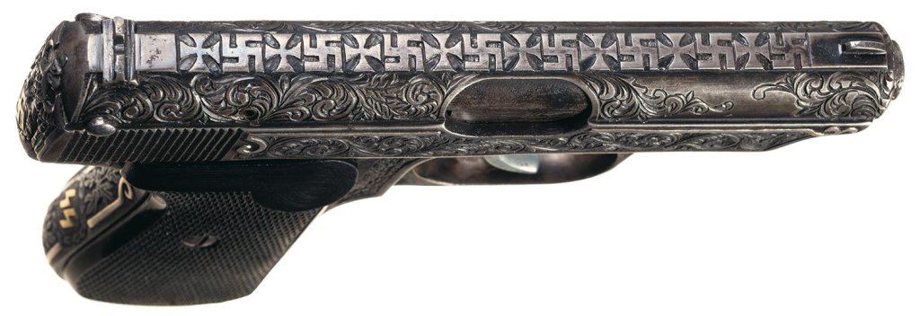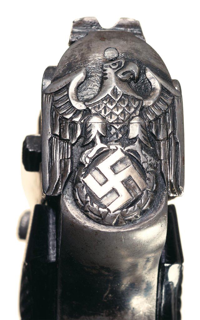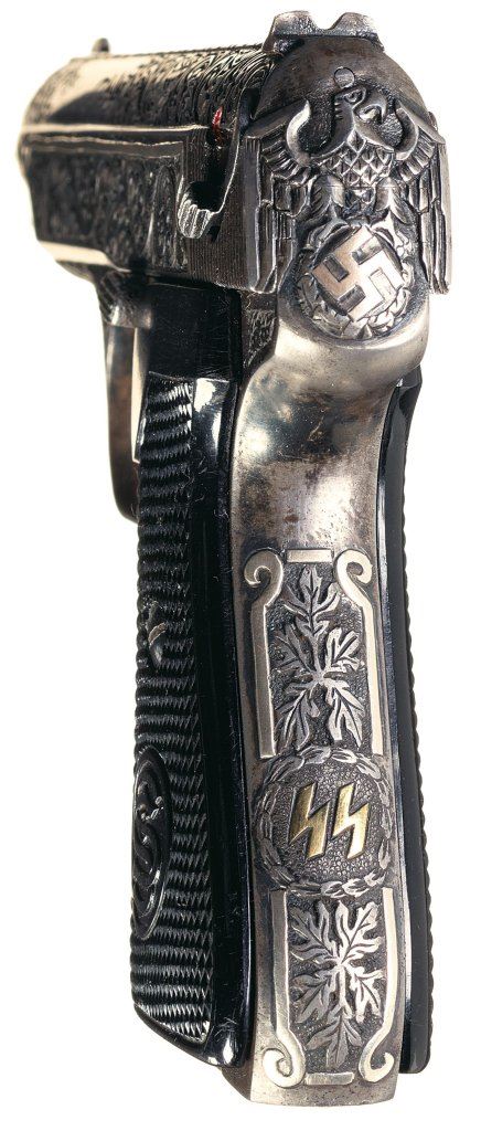 Extensively engraved with oak leaf and Nazi/SS-themed patterns, with an "eagle/swastika C" stamp on the trigger guard, thick silver borders, a 3D "police" eagle on the back of the slide/frame, gold "SS" runes on the back strap, deeply cut alternating swastikas and Iron Crosses on the slide rib, and a sculpted wreath around the muzzle. No signature or maker's marks were found on the pistol.