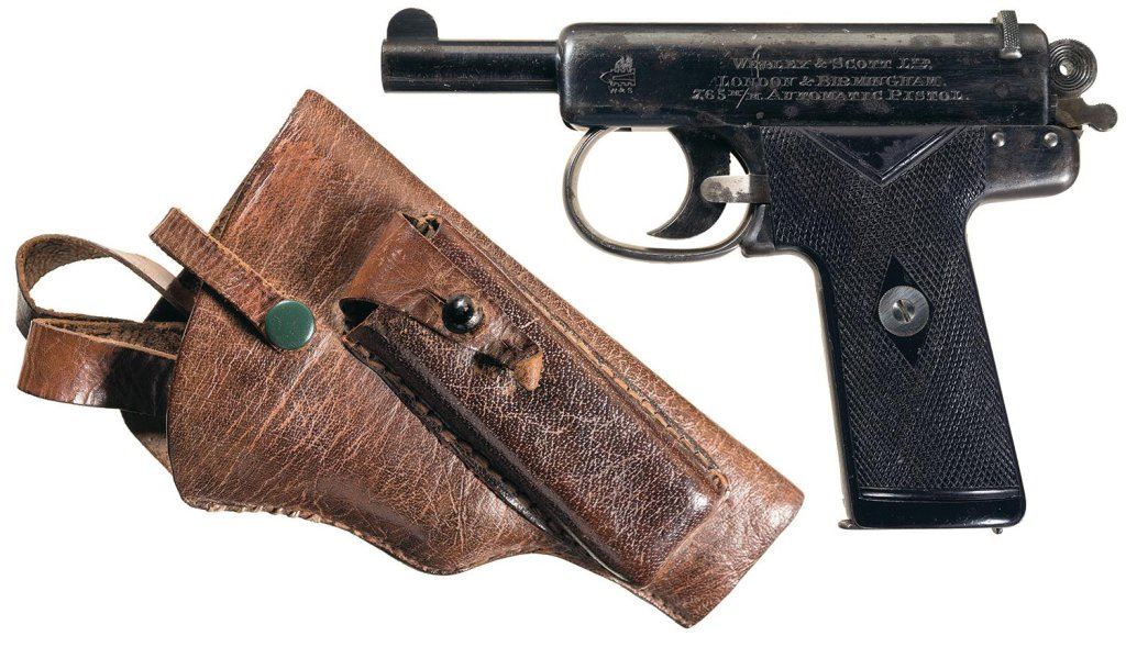 With an unmarked brown leather shoulder holster. This pistol is pictured and identified by serial number on page 114 of "Webley & Scott Automatic Pistols" by Gordon Bruce.