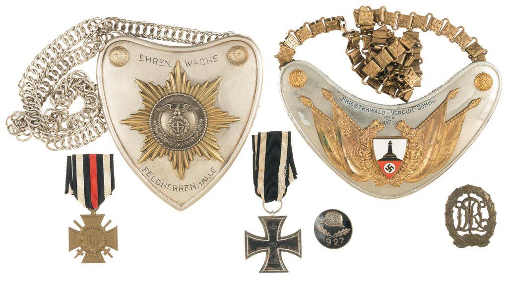 Group incudes a 1914 pattern Iron Cross Second Class, a WWI Honor Cross, a 1927 Stalhelm pin, Nazi-era sport badge, Kyffhauser gorget inscribed "PRIESTERWALD-VERDUN-SOMME/1914/1918" and an "EHREN WACHE/FELDHERRENHALLE" gorget. Good overall, with some wear and stains on the ribbons.