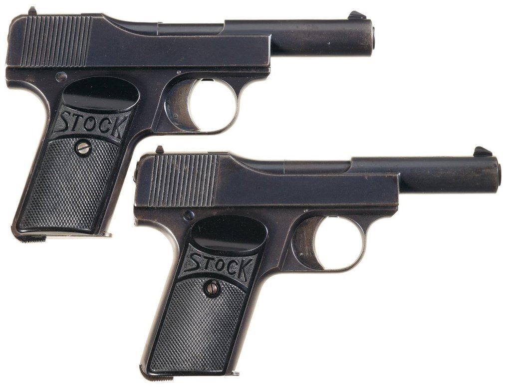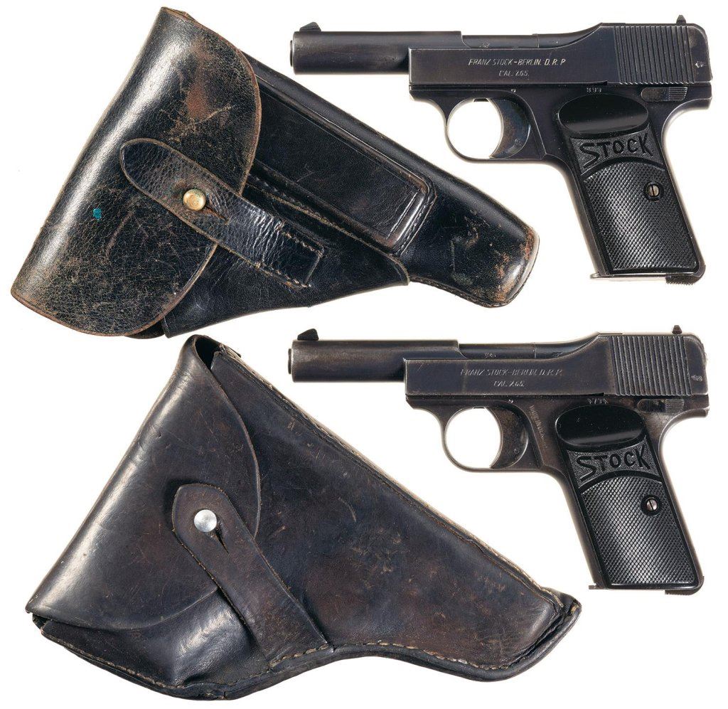 Two Franz Stock Semi-Automatic Hammerless Pistols with Holsters -A) Franz Stock Pistol