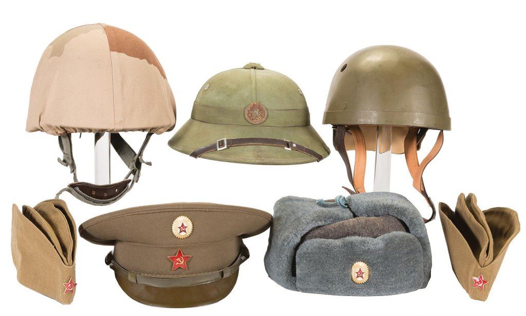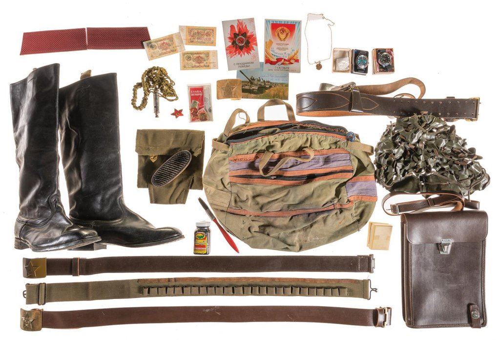 1) One pair of black boots with a polishing brush, bottle of black polish, and applicator brush. Boots are very good. 2) Leather folding case with strap. Very good. 4) Camouflage helmet cover. Very good. 5) One canvas bag and small canvas pouch. Good. 6) Three helmets including one with camouflage canvas cover. Range from good to excellent. 7) Four assorted Soviet military hats. Fair to very good. 8) Assortment of Soviet currency, jewelry, pins, medals, and cards. Good overall 9) Three leather belts with two Soviet belt buckles. Good. 10) One canvas ammunition belt. Fair. 11) Two shoulder holsters with suspension rigs and magazine pouches. Good. 12) One nylon belt with holster, strap, and tool. 13) Two leather holsters with tools and one extra magazine. 14) Three leather magazine pouches. Rifle magazine pouch includes a 30 round AK-47 magazine. Very good. 15) 15 assorted leather holsters, some with Iraqi Republican eagle markings. Good to very good.