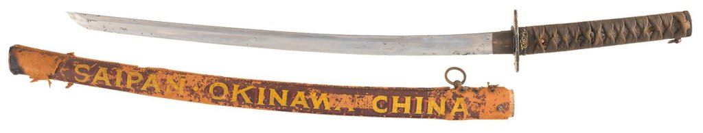 33" OAL, 23 1/4" blade with a straight hamon, copper habaki, 4-lobed iron tsuba, floral themed gold accented furniture, and a leather covered saya with "SAIPAN * OKINAWA * CHINA" painted on the side. Two mekugi-ana are present on the very aged tang, with a 2-symbol signature on the left side. The blade shows a number of chips, a few cracks, and scattered pitting, and the furniture shows a great deal of wear and tear. Though not documented, the features and condition suggest a field-captured American Marine/G.I. war trophy.