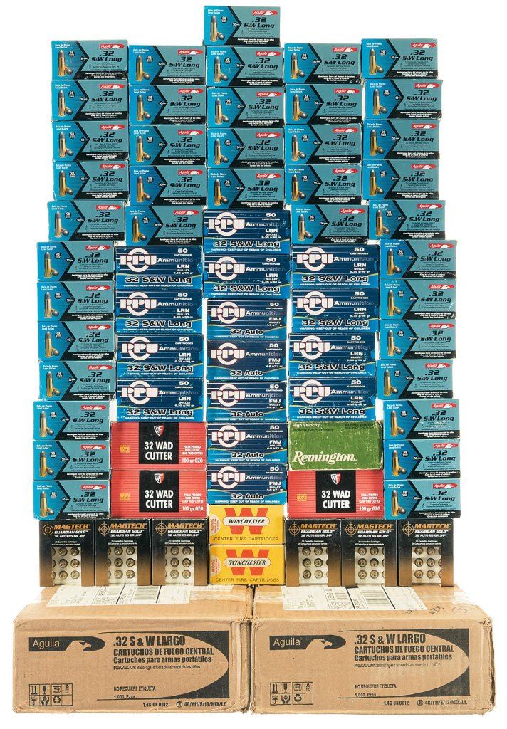 The lot includes: 2 sealed cases of Aguila (1,000 rounds each) of 32 S&W long ammo; 39 boxes Aguila (50 round each) 32 S&W long; 15 boxes PPU (50 round each) 32 S&W long; 6 boxes Magtech (20 round each) 32 auto; 3 boxes Fiocchi (50 round each) 32 Wad Cutter; 1 box Remington (50 round) 32 automatic; 2 boxes Winchester (1 full &1 partial) 32 automatic. Ranging from new to very good.