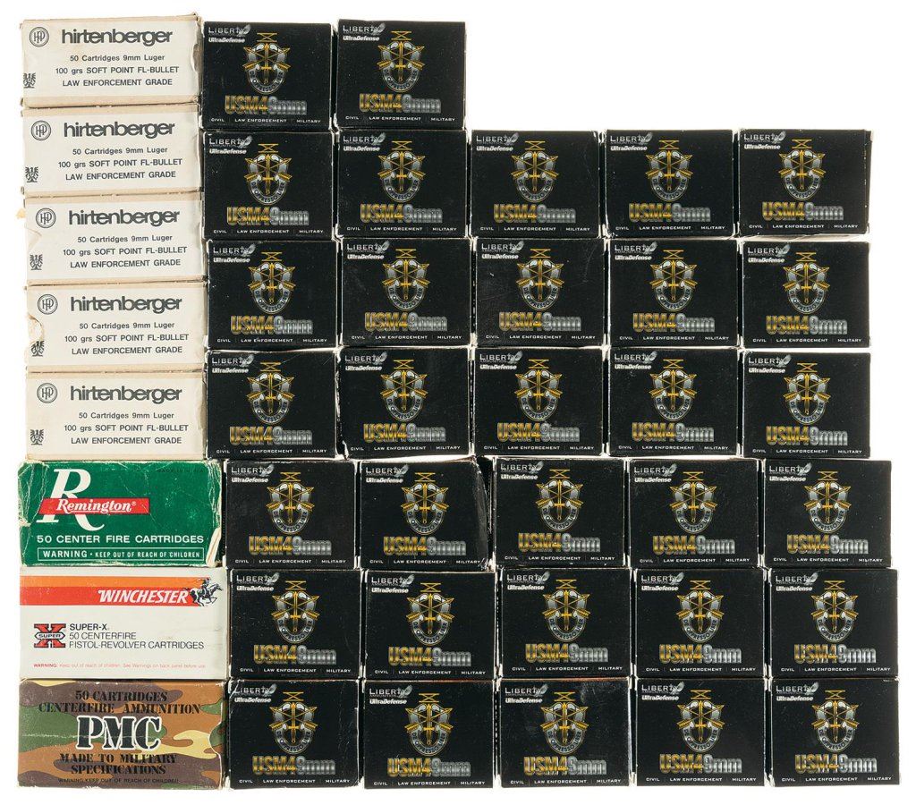 The lot contains 50 boxes of varied 9 mm ammunition including: 32 boxes (20 round each) Liberty 9mm; 5 boxes (50 round each) Hirtenberger 9mm Luger; 1 box (50 round each) PMC 9mm Luger; 1 box (50 round each) Winchester 9mm Luger; 1 box (50 round each) Remington 9mm Luger. Ranging from new to very good with some wear on the older boxes.