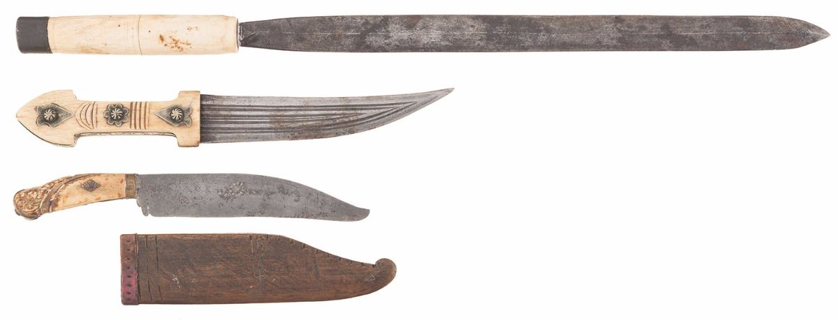 The lot consists of: 1) Unmarked African style long knife. Fitted with a 15" straight double edged blade and bone grip. 2) Jambiya style dagger with a 6 1/2" curved double edge blade and carved bone grips. 3) Piha Kah Etta dagger with 6" curved single edge blade, wood sheath, and carved bone grips. Items range from fair to fine.