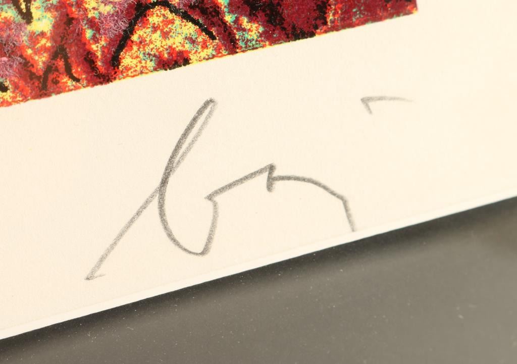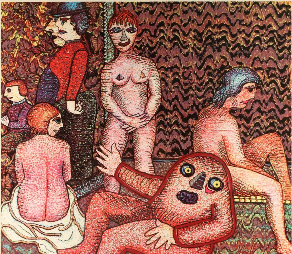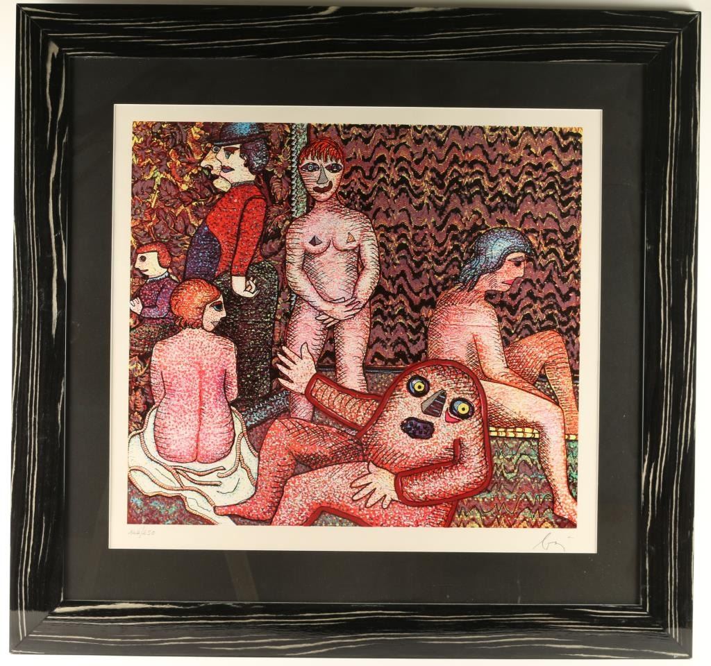 Depicting modern nudes at spa by Enrico Baj 142/250, signed lower right corner. Image measures 28"x26" with single mat and black wood frame. Enrico Baj was the founder with Sergio Dangelo of the "Nuclear Art Movement" in Milan in 1951 and founder with Asger Jorn of an international movement for an imaginary Bauhaus in Albissola, Italy in 1953. In 1954 he was a contributor to numerous avant-garde magazines. Baj did his first collages and assemblages in Milan in 1956. He was associated with the Nouveau Realiste group in Milan. He traveled to New York, associating with Duchamp in 1962, Andre Breton in Paris in 1963, and Max Ernst in Paris from 1963 from 1966. His works are overflowing with highly stylized nude figures and animals - lions, camels, horses, goats - encrusted with a gaudy array of sequins, watch faces, military patches and braids, many of which Baj bought in bulk on his last trip to New York. These paintings turn their back on all notions of decorum and good taste, but that's something Baj has been doing for most of his career. But for all its vulgarity and kitsch, his work has a very serious theme: the population explosion. He further concentrated on multiple and editioned works of art in Milan, 1966.