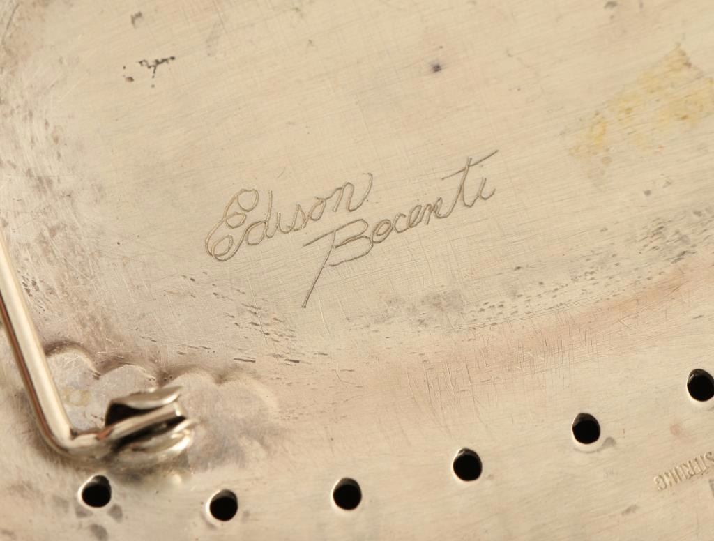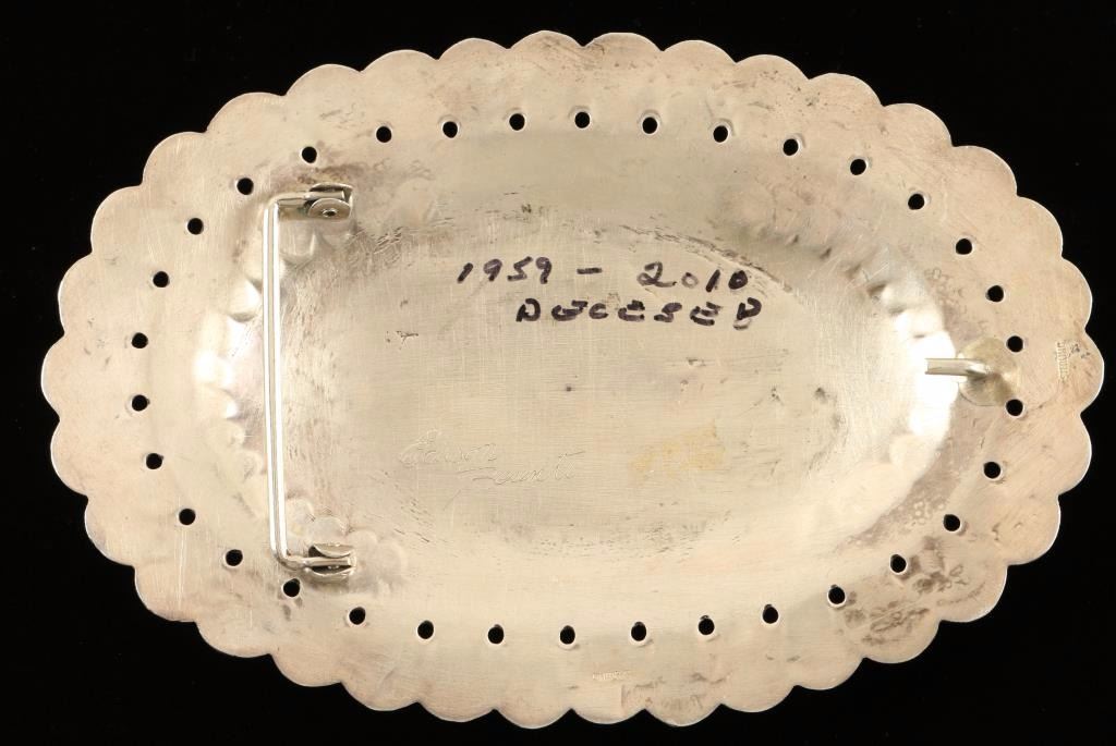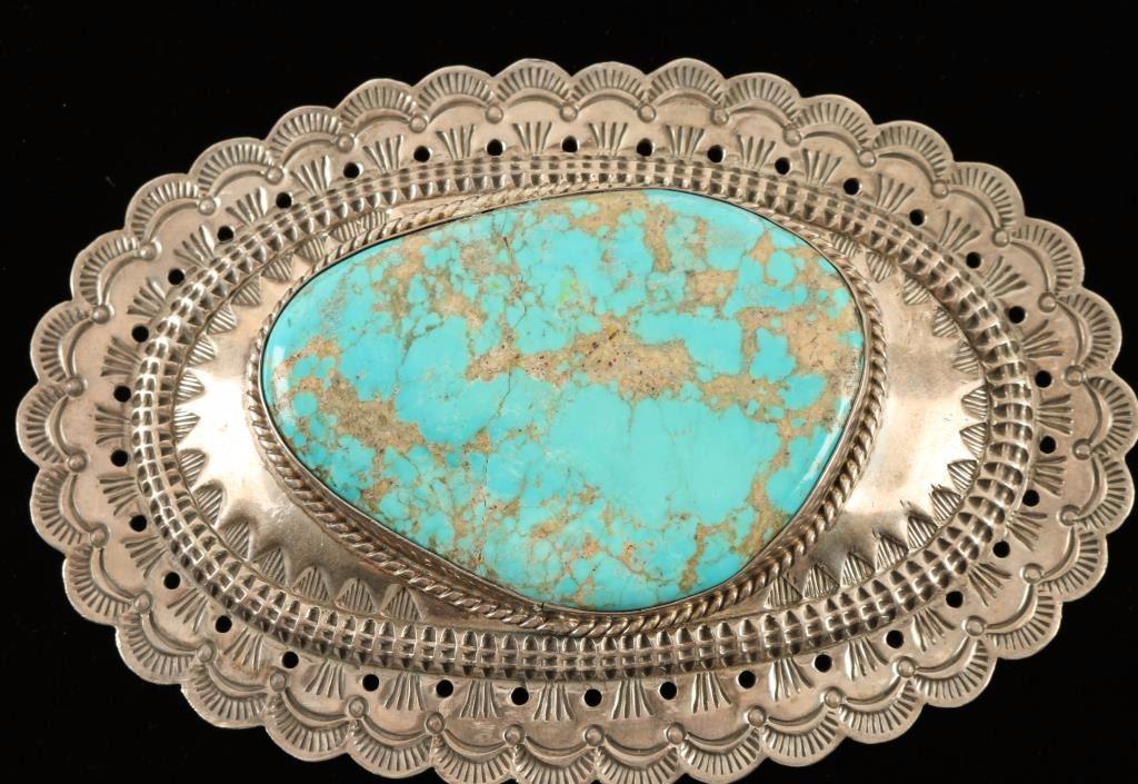 Made by noted Navajo artist Edison Bocenti. Set in sterling silver with a traditional stamped design. Retail $1200. Measures 7" across, 4 1/2" wide.