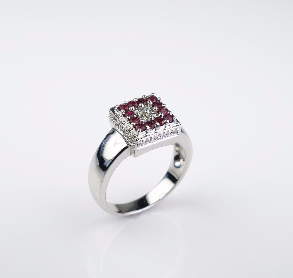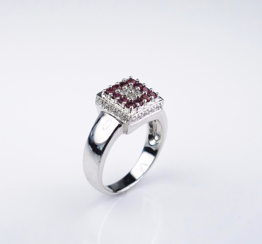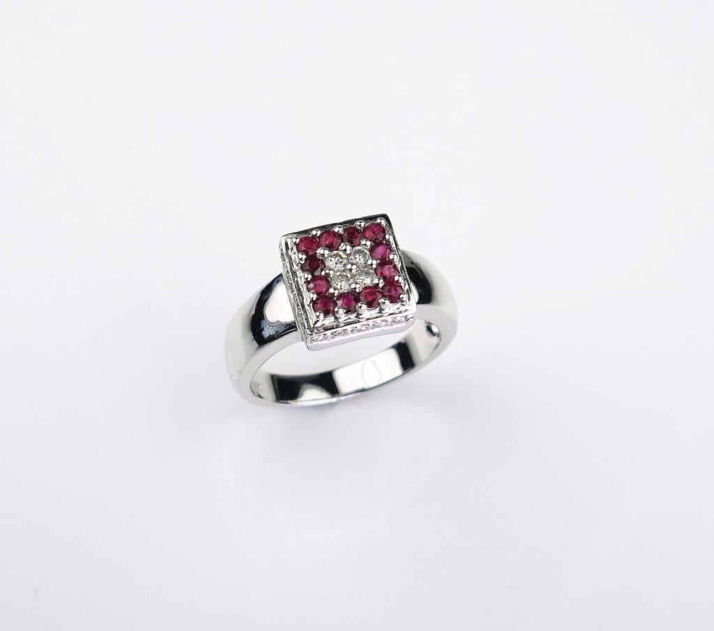 Set with 16 round diamonds and red Rubies weighing approx. 0.40 carats set in an 18 karat white gold custom made setting.