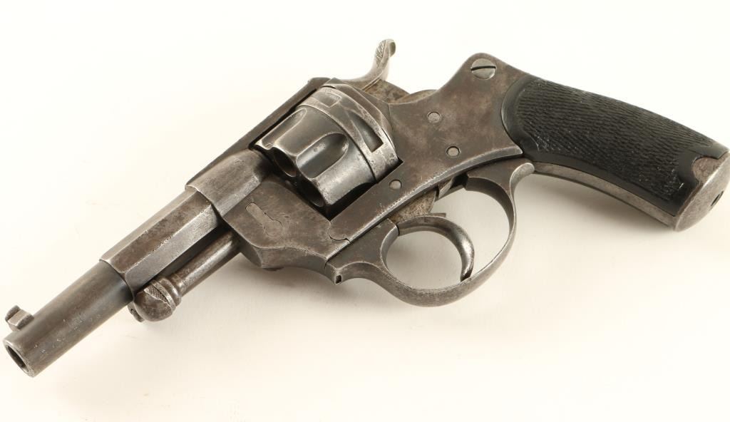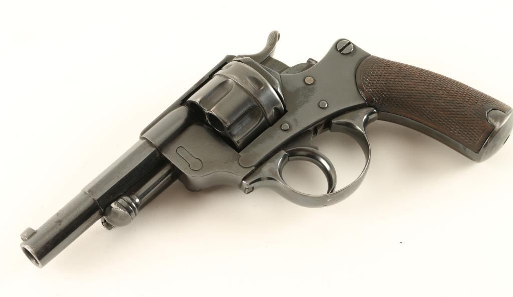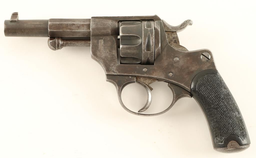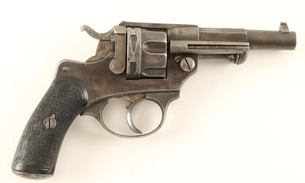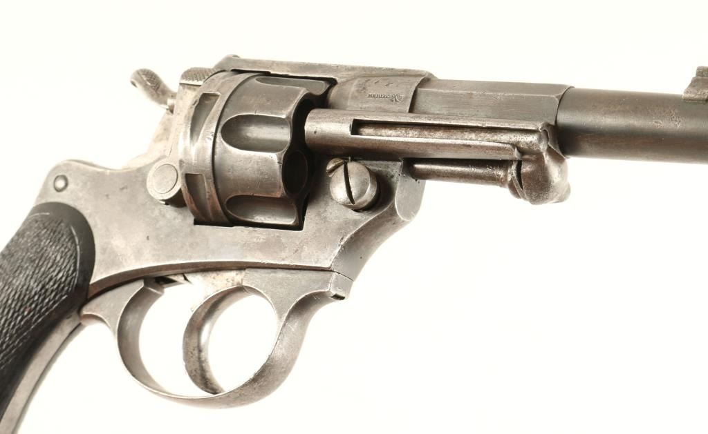 French officer's double action revolver chambered in 11x17Rmm, produced at the St. Etienne armory between 1874 - 1886. Features a blued finish, 4.7" half-octagonal barrel, blade front sight, notched rear sight, fluted six shot cylinder, ejector rod, checkered hammer spur, rounded trigger, and black checkered wood grips. Revolver retains approximately 20-30% finish with bluing turning to a brown patina. Action currently works as single action only but does not rotate the cylinder, bore is good with light pitting, and grips are good+. Condition is good. ***Antique Firearm***