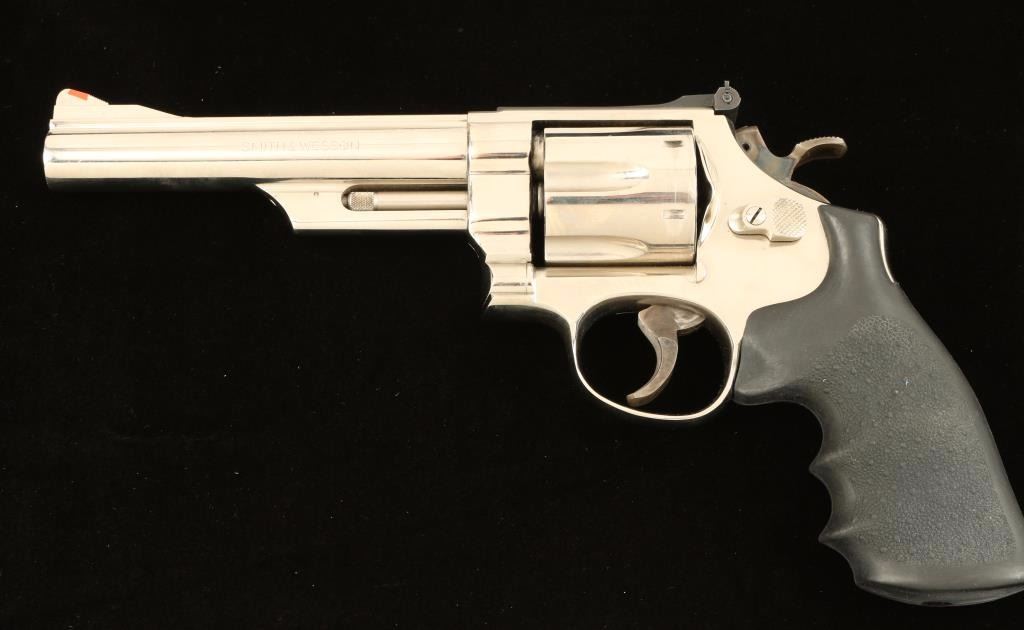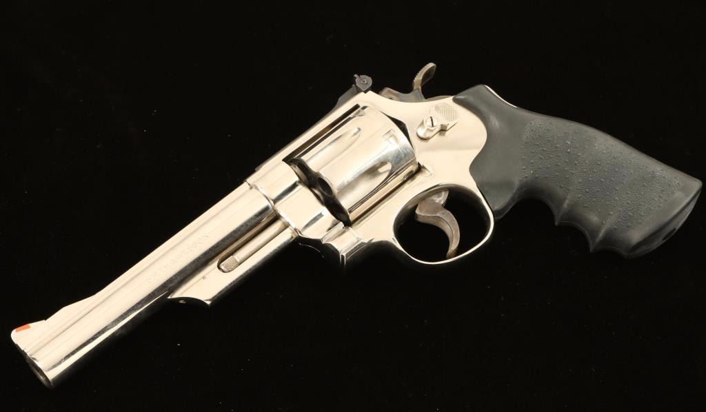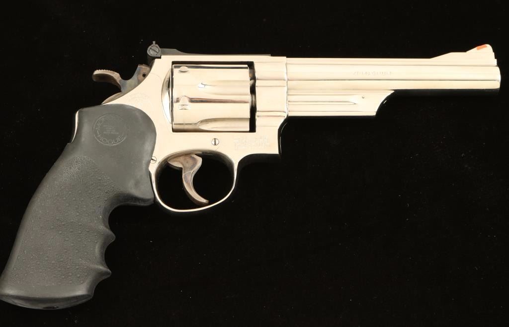 Large frame double action revolver chambered in .41 Magnum. Features a nickel plated finish, 6" ribbed barrel, ramped front sight with orange insert, adjustable micrometer click rear sight with white outline, shrouded ejector rod, fluted six shot cylinder, serrated target trigger, target hammer with wide checkered spur, and peddled black rubber Hogue Monogrip. Includes a wood display case with tool, cleaning rod, brush & mop. Revolver shows light muzzle wear and few minor handling marks. Action is smooth, bore is excellent, and grip is fine. Condition is near excellent is case. ***Modern Firearm***