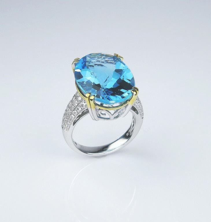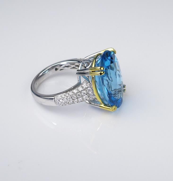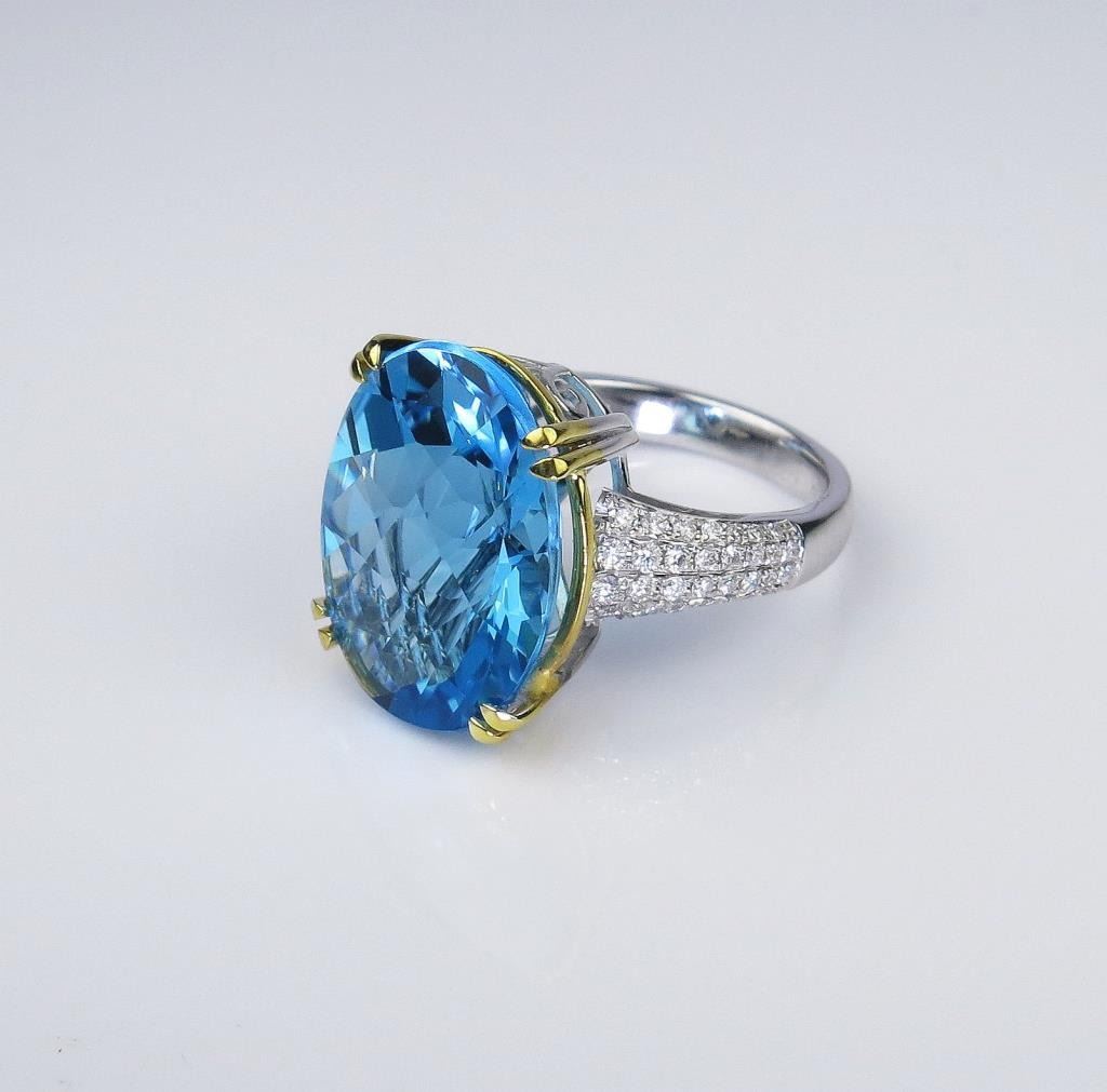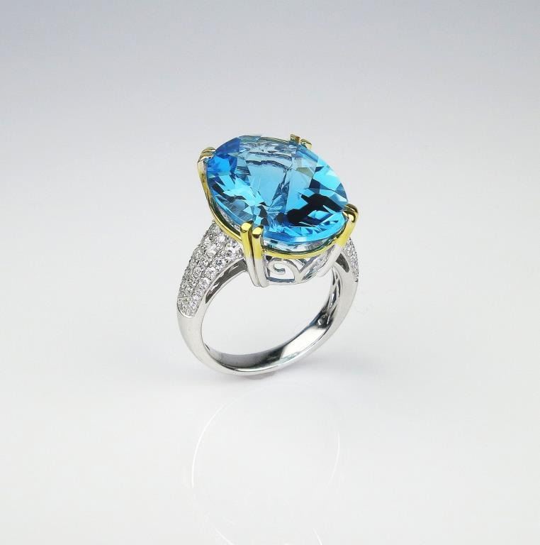 Set with a fine checkerboard cut Swiss Blue Topaz weighing approx. 18.00-20.00 carats and micro set with 60 round 'IDEAL' cut Diamonds weighing approx 0.90 carats of F-G colors and VS/SI clarity set in a 14 karat two-tone custom made setting. Very labor intensive.
