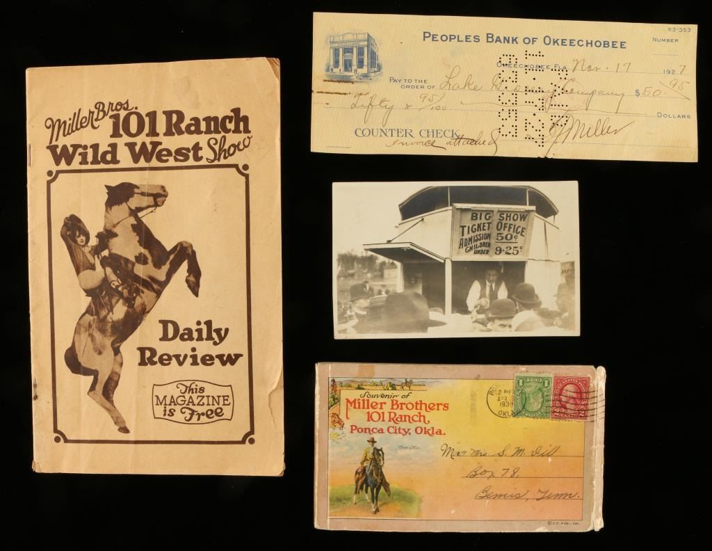 Souvenir book of postcards, Miller Brothers 101 Ranch Ponca City, OK, April 25,1930 postmark. Also included is a 101 Ranch Daily Review magazine. Bank note from the People's Bank of Okeechobe-paid to the order of Lake Grocery Company for $50.95, November 17, 1927-signed by George L Miller. Souvenir postcard that shows a ticket office for the 101 Ranch. Came from the contents of a trunk reportedly owned by Mr. Sweeney, director of the Buffalo Bill Band.