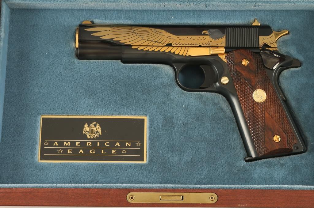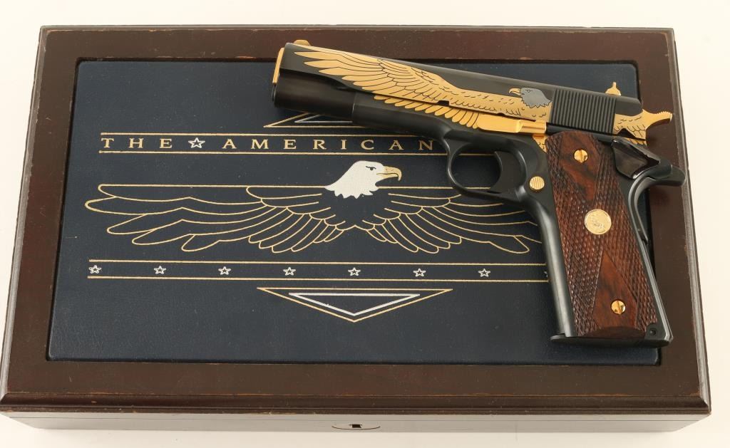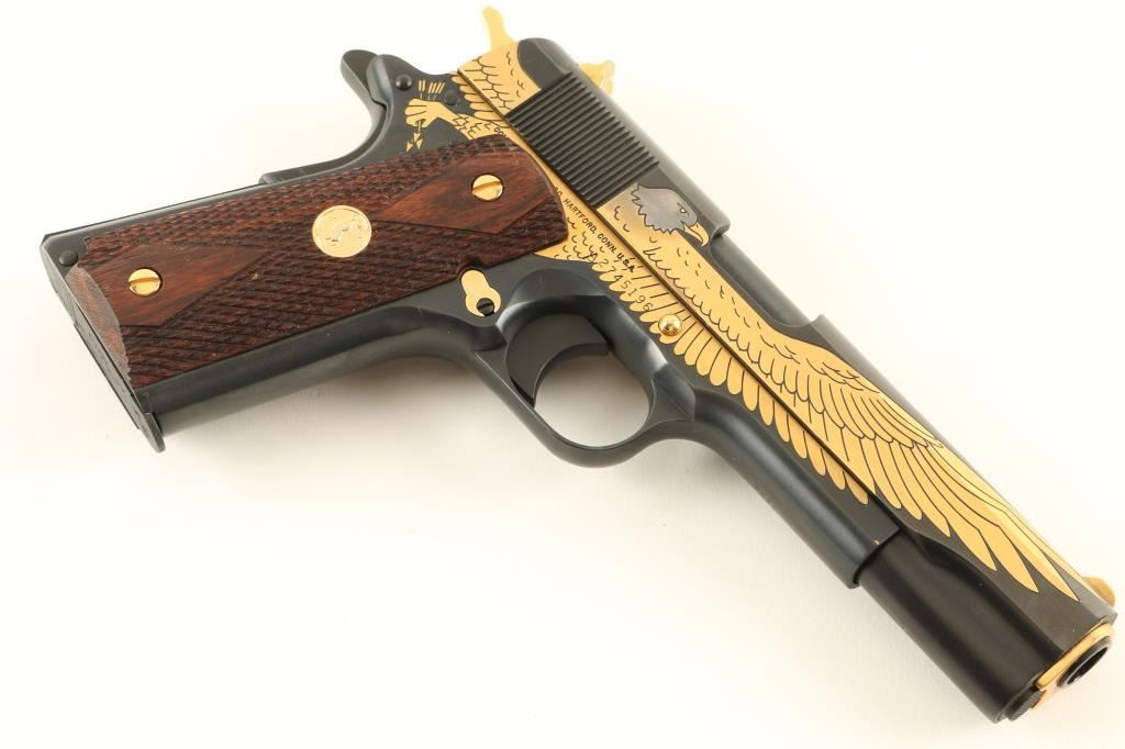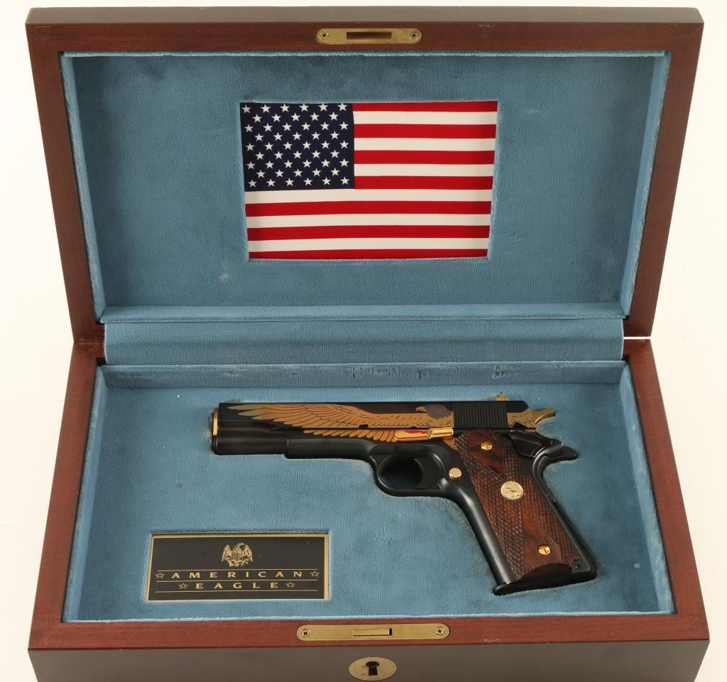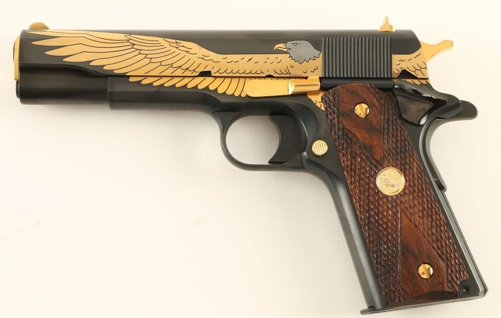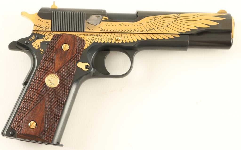 SN: A2745196 'Government Model' Heavily adorned semi automatic pistol with large eagle effigy, chambered in .45 Automatic. one of only 2,500 produced. Features a blued finish with numerous gold accents, patridge front sight, dovetailed rear sight, 5" barrel, manual & grip safety, push button magazine release, 7 round magazine, and Colt medallion double diamond checkered rosewood grips. Includes it's original display case with velvet lining, flag and plaque. Pistol shows little to no wear. Action is crisp, bore is excellent and grips are extra fine. Condition is like new in case. ***Modern Firearm***