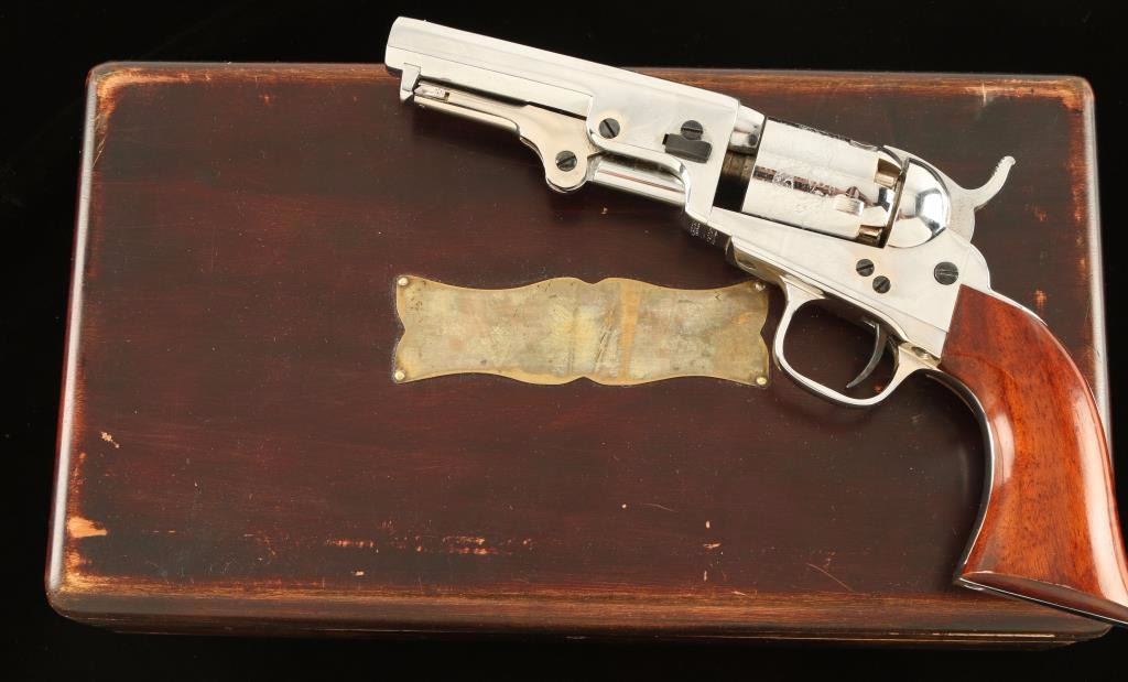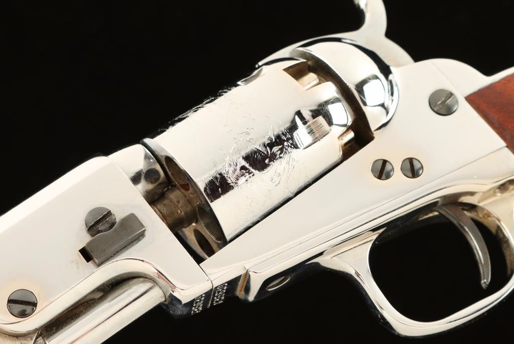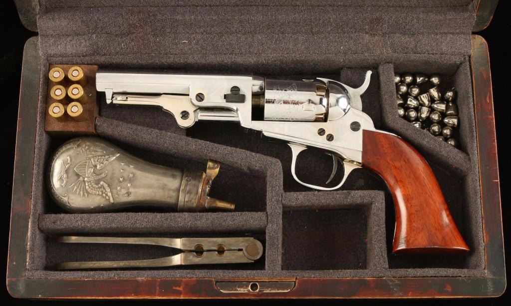 Cased Italian made copy of a Colt 1849 Pocket single action percussion revolver in .31 caliber. Features a nickel finish, 4" octagonal barrel, cone front sight notched rear sight on hammer, loading lever, non-fluted five shot cylinder with roll stamped stagecoach hold-up scene, checkered hammer spur and varnished one piece walnut grip. Includes a locking partitioned wood presentation case with large brass escutcheon, grey felt lined interior, bullet mold, powder flask, key, and .32 S&W ammunition. Revolver shows little to no wear. Action is crisp, bore is excellent and wood grip is fine. Condition is like new in case. ***Antique Firearm***