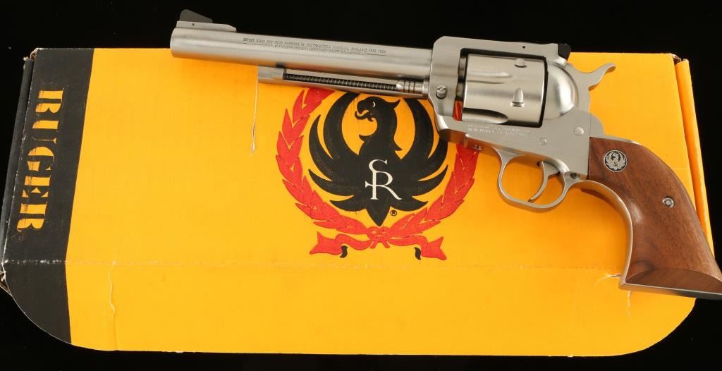 Stainless steel double action revolver chambered in .357 Magnum. Features a satin finish, 6.5" barrel, ramped & pinned blade front sight, adjustable click rear sight, flat top frame, ejector rod, fluted six shot cylinder, transfer bar safety, smooth trigger, serrated hammer spur, and two piece Ruger medallion smooth wood grips. Includes factory cardboard box with documents. Revolver shows only minor handling marks. Action is smooth, bore is pristine, and grips are fine. Condition is excellent in box. ***Modern Firearm***