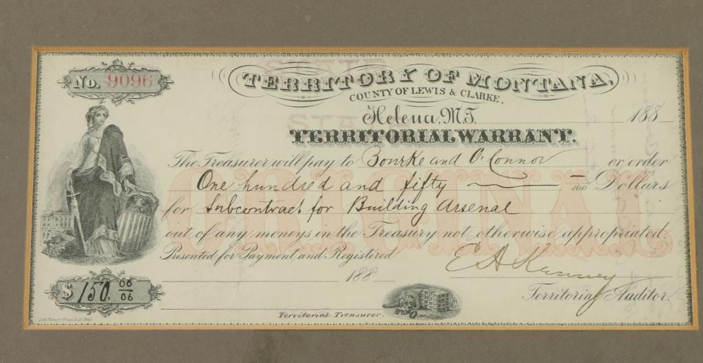 Check No. 9096, dated on the back, Dec. 16, 1889. Issued to Bourke and O'Connor for building weaponry (arsenal) for use by the standing Military or Militia in the Territory of Montana. This particular vintage warrant for Helena, Montana, County of Lewis & Clarke, for $150.00 never made it to the State Treasurer for signature. This very unique collectible of early Montana and American history is in Excellent condition behind a two sided glass frame, matted and framed. Measures 7"x12" overall.