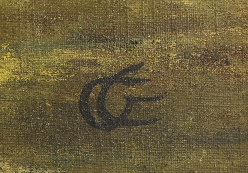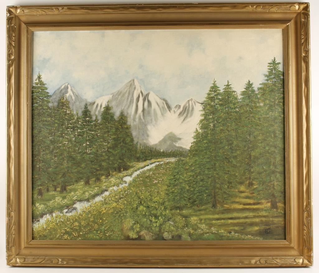 Painting of stream in high mountains. Signed lower right C.G. out of Colorado Collection. In gold wood frame, image measures 35"x29". Some of gold finish has worn off frame.