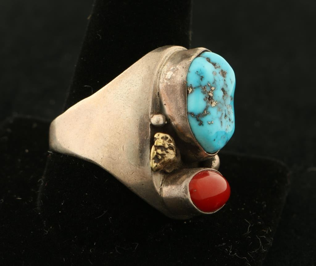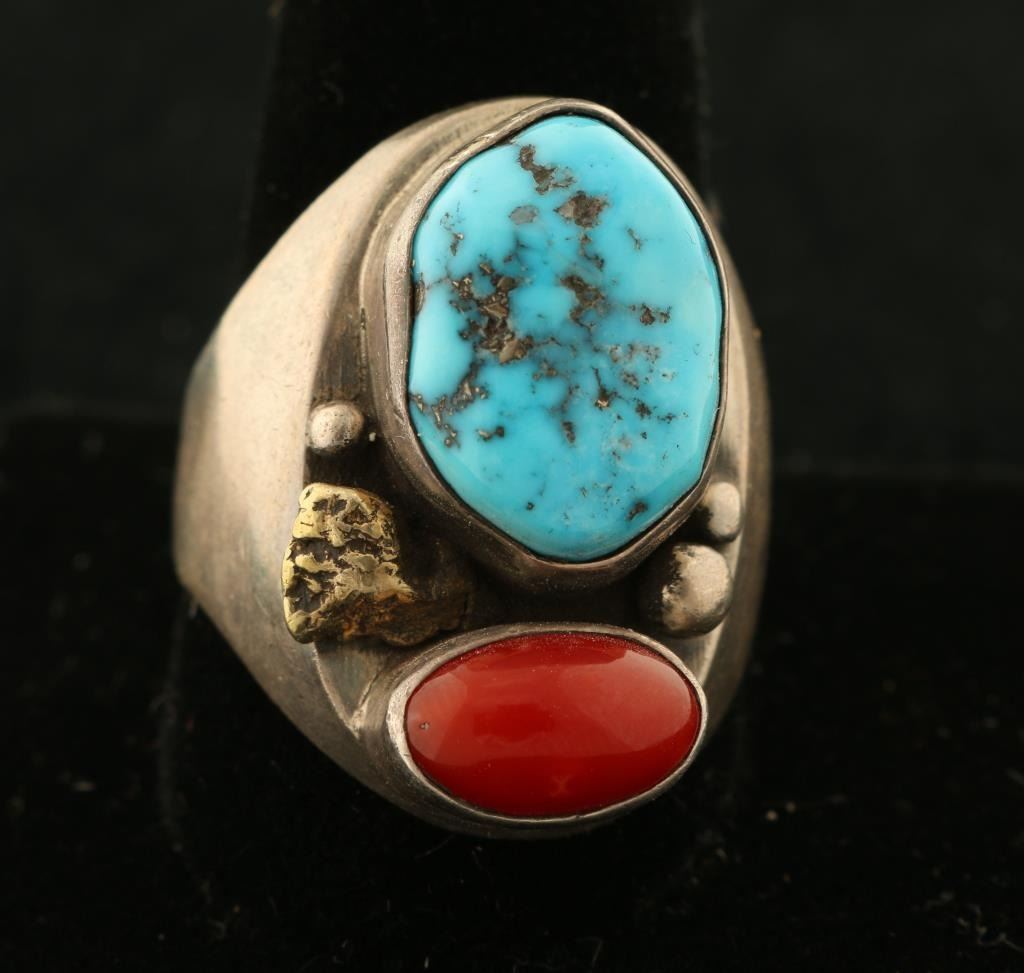 Small oval of Mediterranean coral above turquoise nugget set in sterling silver. Size 11.5.