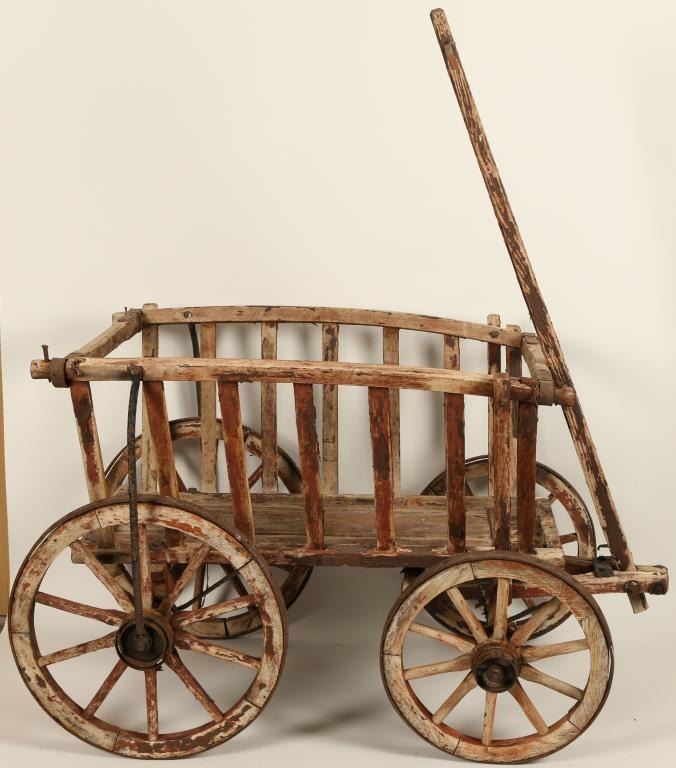 Rustic cart with open slat sides. Wood and metal construction. Great piece to display plant pots outdoors or indoor Western decor. Measures 42"x26"x23".