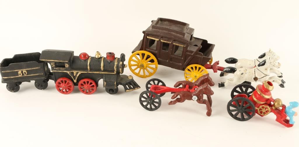 Including; an iron black locomotive and tender, a brown two horse drawn Red Fire Wagon with a fireman up at the helm, a brown stagecoach driven by a white two horse team. All in good condition. Also includes