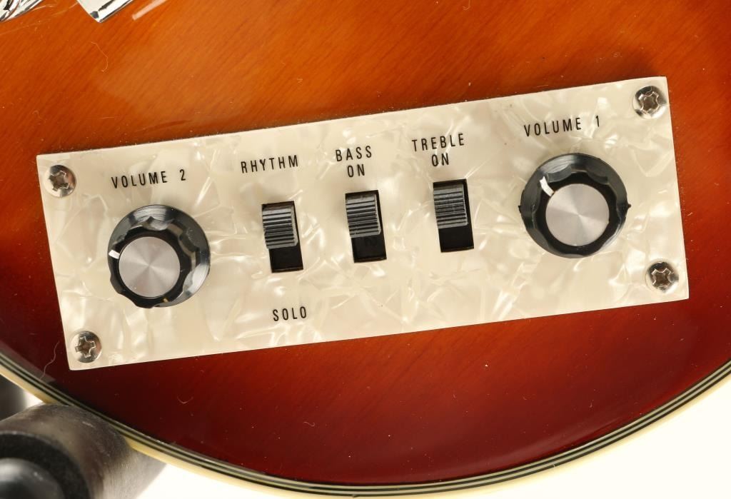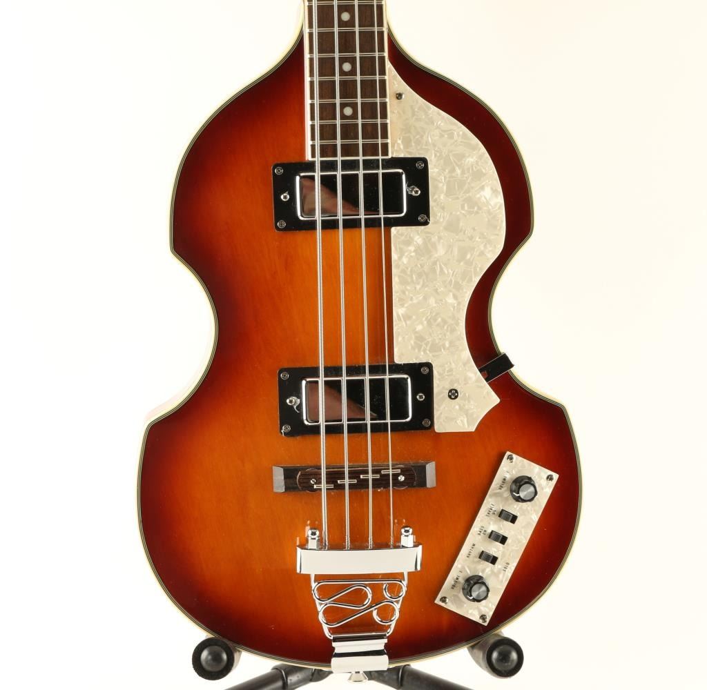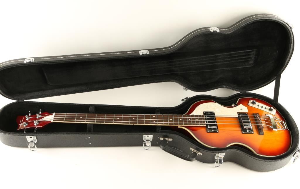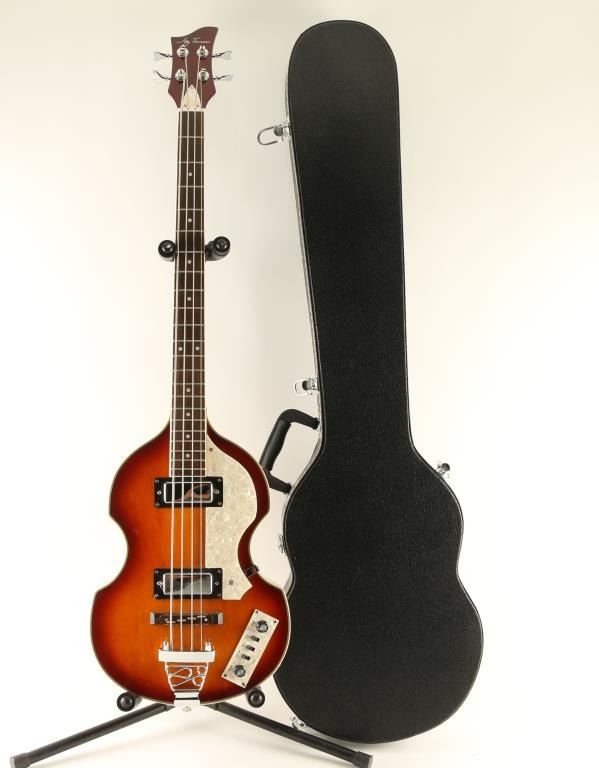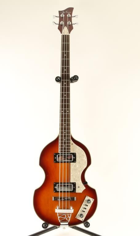 A new/used bass. Called "the poor man's Hofner". Two pick up, two volume with treble, bass and rhythm switches. Comes with custom hard case.