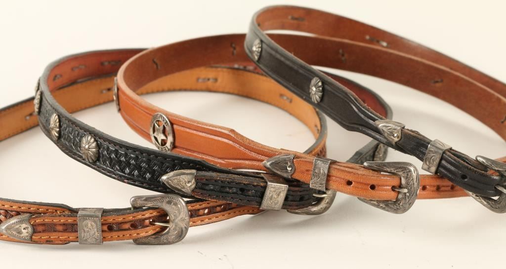 Brown and black leather, 2 with basketweave design and 2 smooth leather. Sterling buckle sets with star and floral conchos.