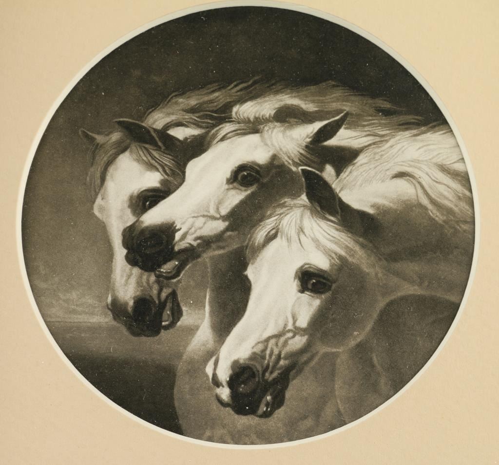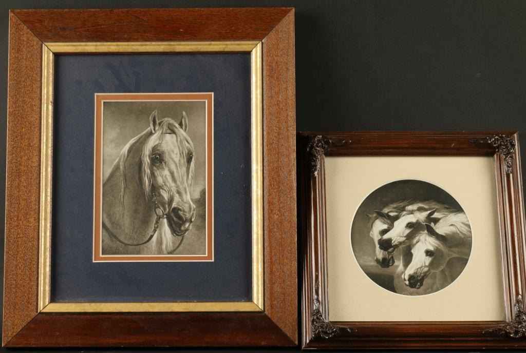 "A Noble Charger" by Rosa Barker of Buffalo Bill's Arab. Muson Perry Print 1917. Double mat and wood frame, image measures 4"x6". "Pharaoh's Horses" Nicely matted with circle cut opening and ornate wood frame. Image measures 4 1/2" diameter.