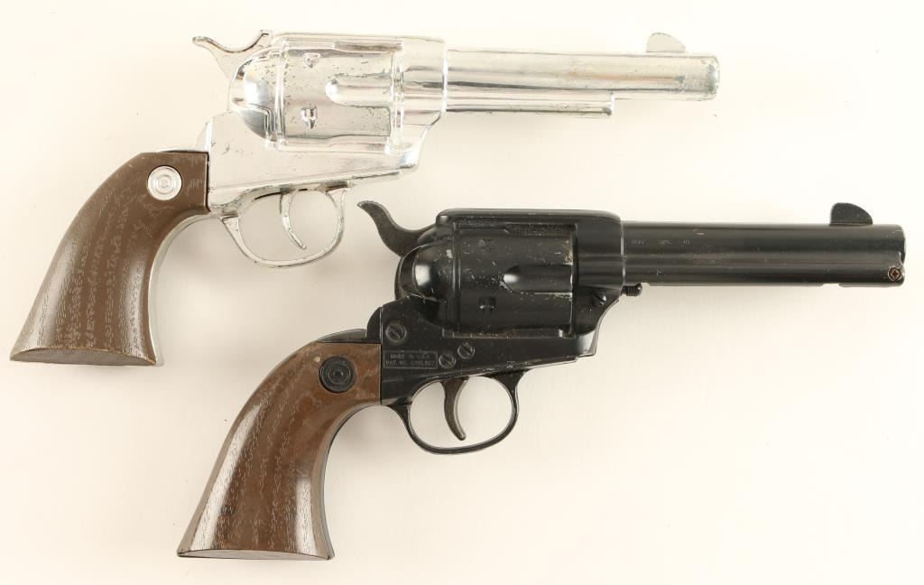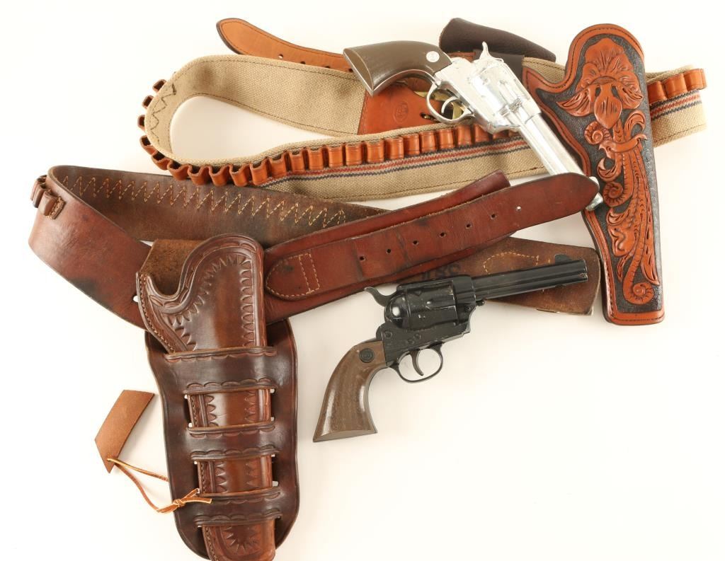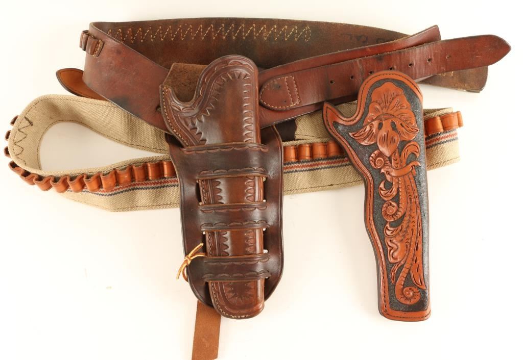 1 for a Colt 7 1/2" smooth brown leather with cartridge loops and tooled geometric design on holster. Cartridge belt 38" with large silver metal buckle. Stamped 'Hunter' in logo and '158 Med'. 1 canvas belt with red and blue stripes with small ammo pouch with star concho. Holster is brown and black with floral tooling. Belt is stamped 'San Pedro Saddlery Tombstone' size 44/45. Both include toy revolvers.