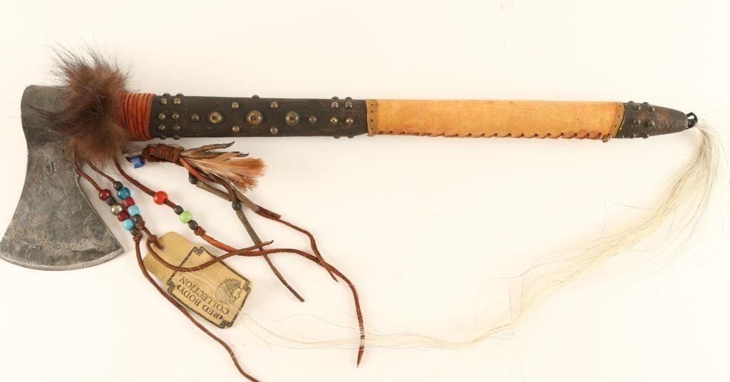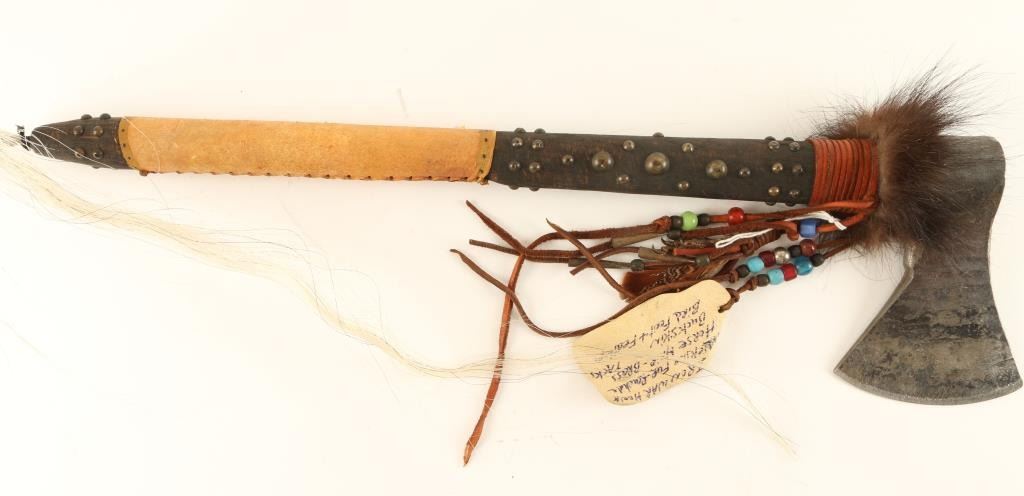 Rawhide wrapped handle with brass tack, horsehair, buckskin, bird foot, beads and feather accents. Nice display piece.