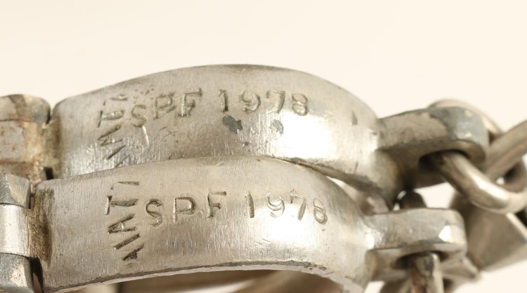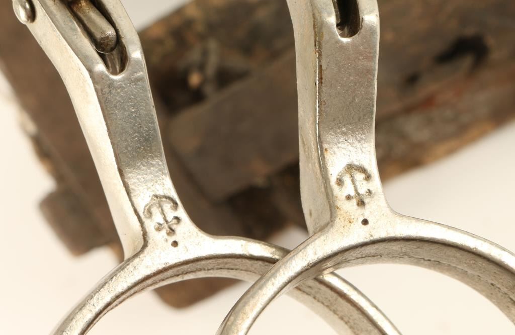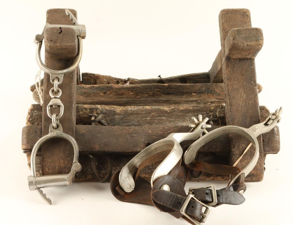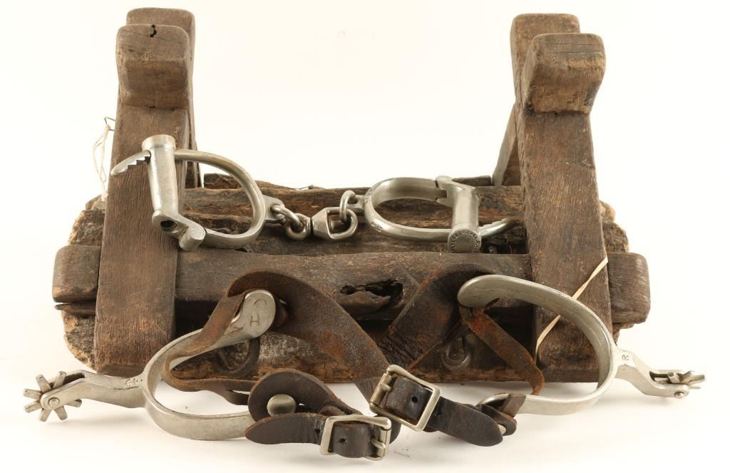 Pair of spurs with smooth brown leather straps with silver metal buckles and small rowels, small pair of handcuffs missing key and a rustic saddle tree.